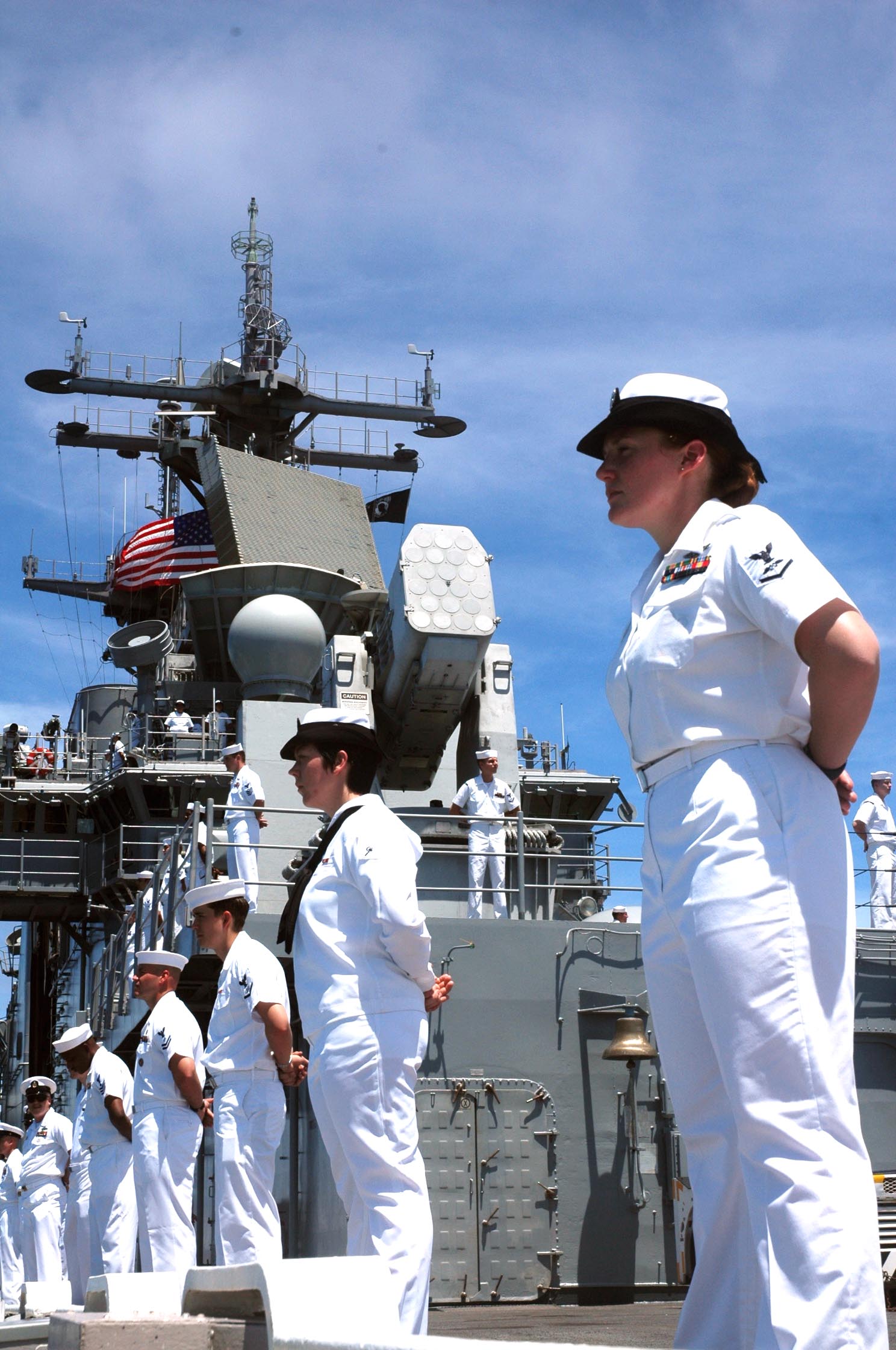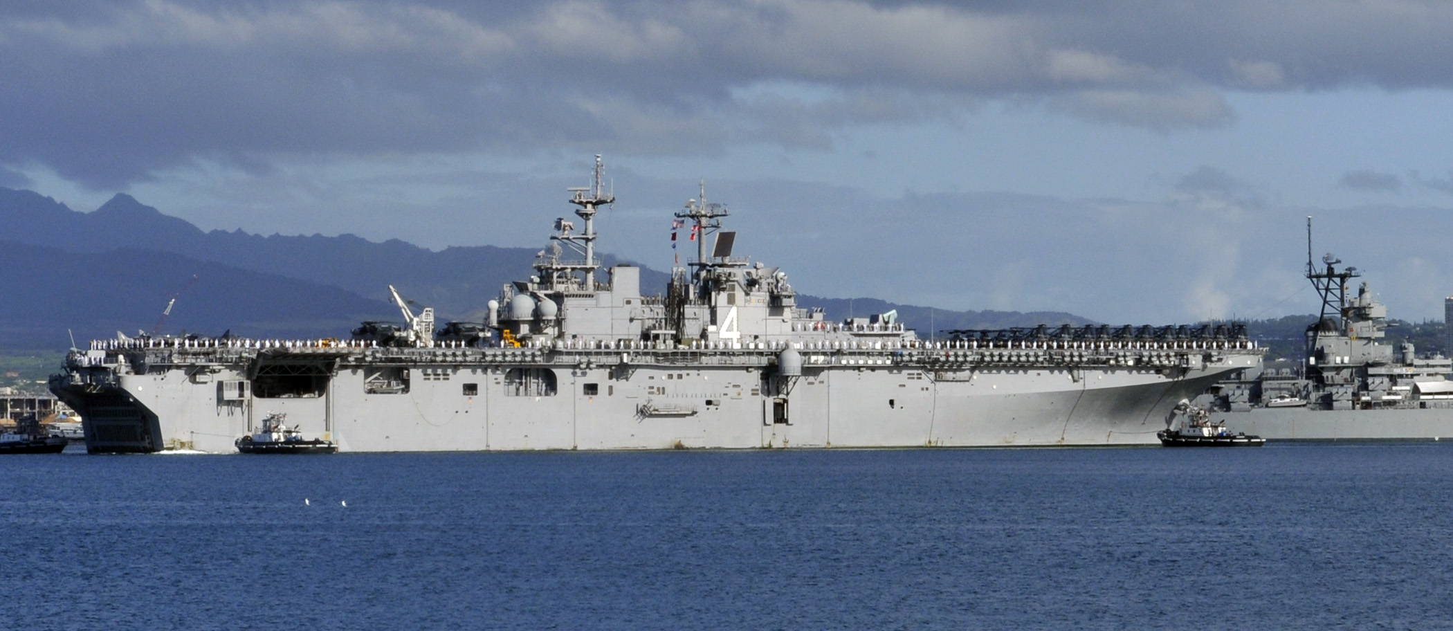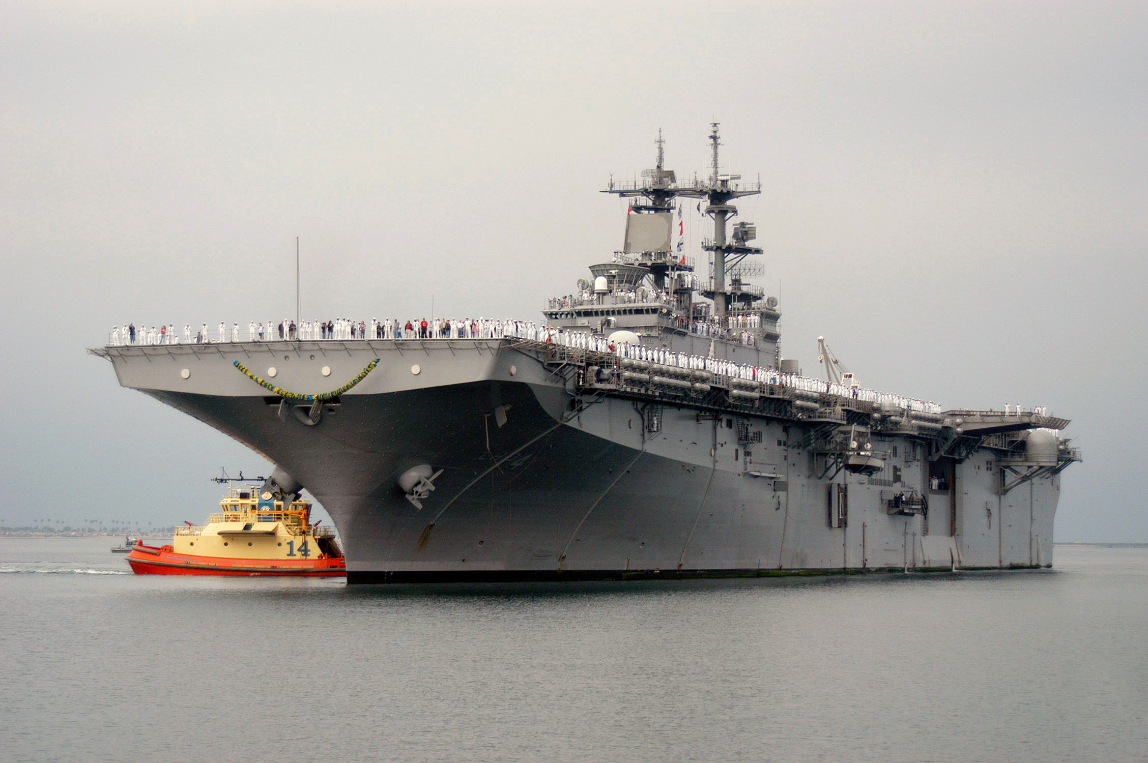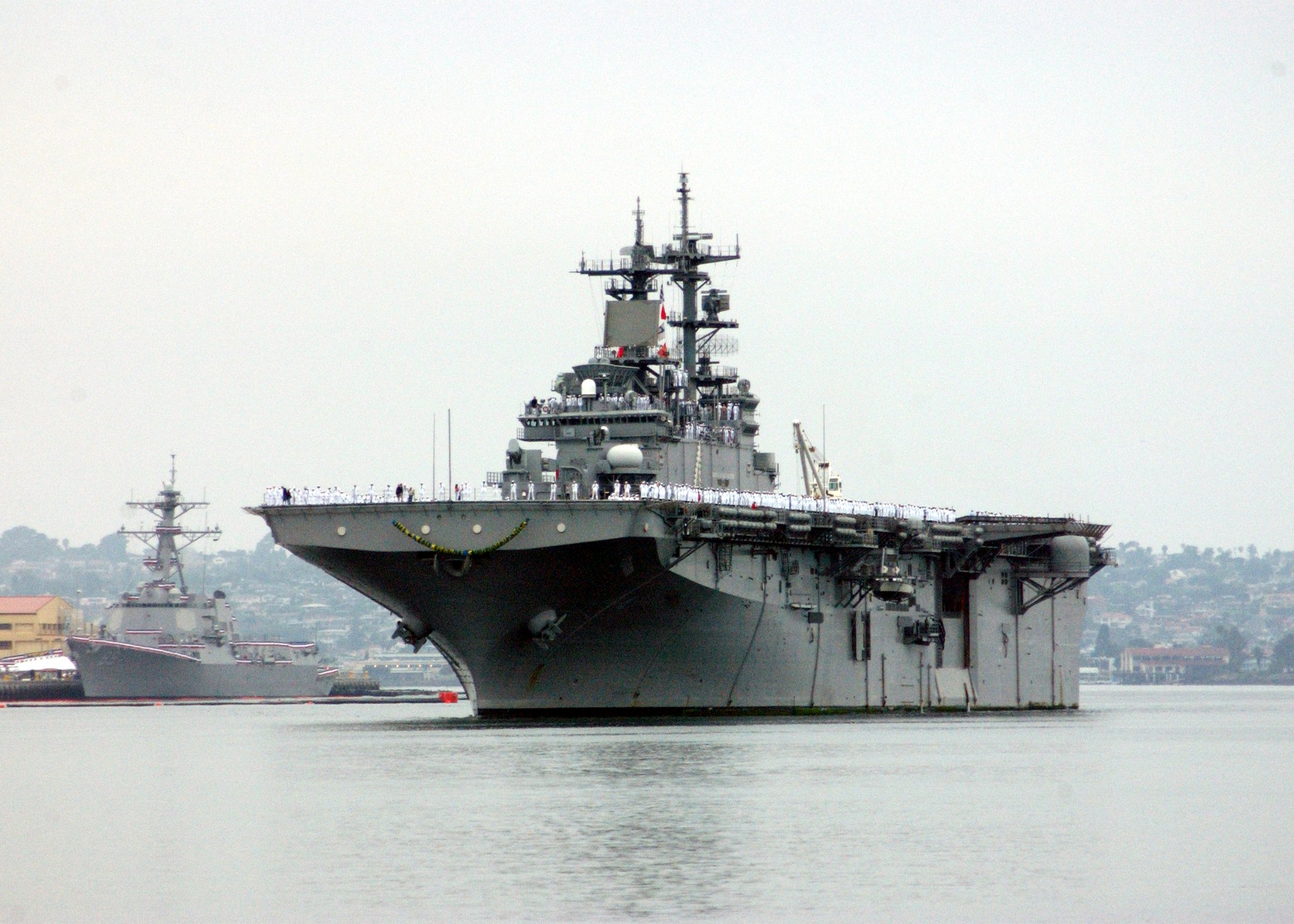 61k | USS Boxer (LHD-4)'s crew man-the-rails as the ship returns to her homeport at Naval Base San Diego, 15 September 2005. Boxer completed a four-and-a-half month surge deployment providing support to 7th Fleet exercises including Exercise Talisman Sabre, a joint exercise with Australia and Cooperation Afloat Readiness and Training (CARAT), where Boxer worked closely with Malaysian Army and Naval forces. US Navy photo # 050914-N-7949W-001 by PH1 Daniel N. Woods. |