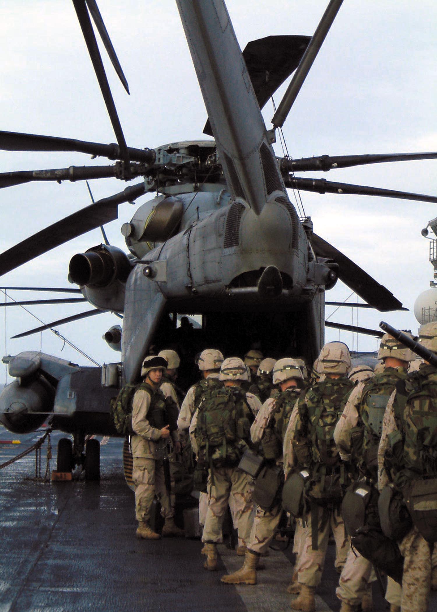 310k | Marines board a CH-53E Super Stallion for transit from USS Boxer (LHD-4) to Kuwait. Boxer and embarked Marines are deployed in support of Operation Enduring Freedom. US Navy photo # 030227-N-2321D-001 The Arabian Sea (Feb. 27, 2003) by SKC Denise Depozo. |