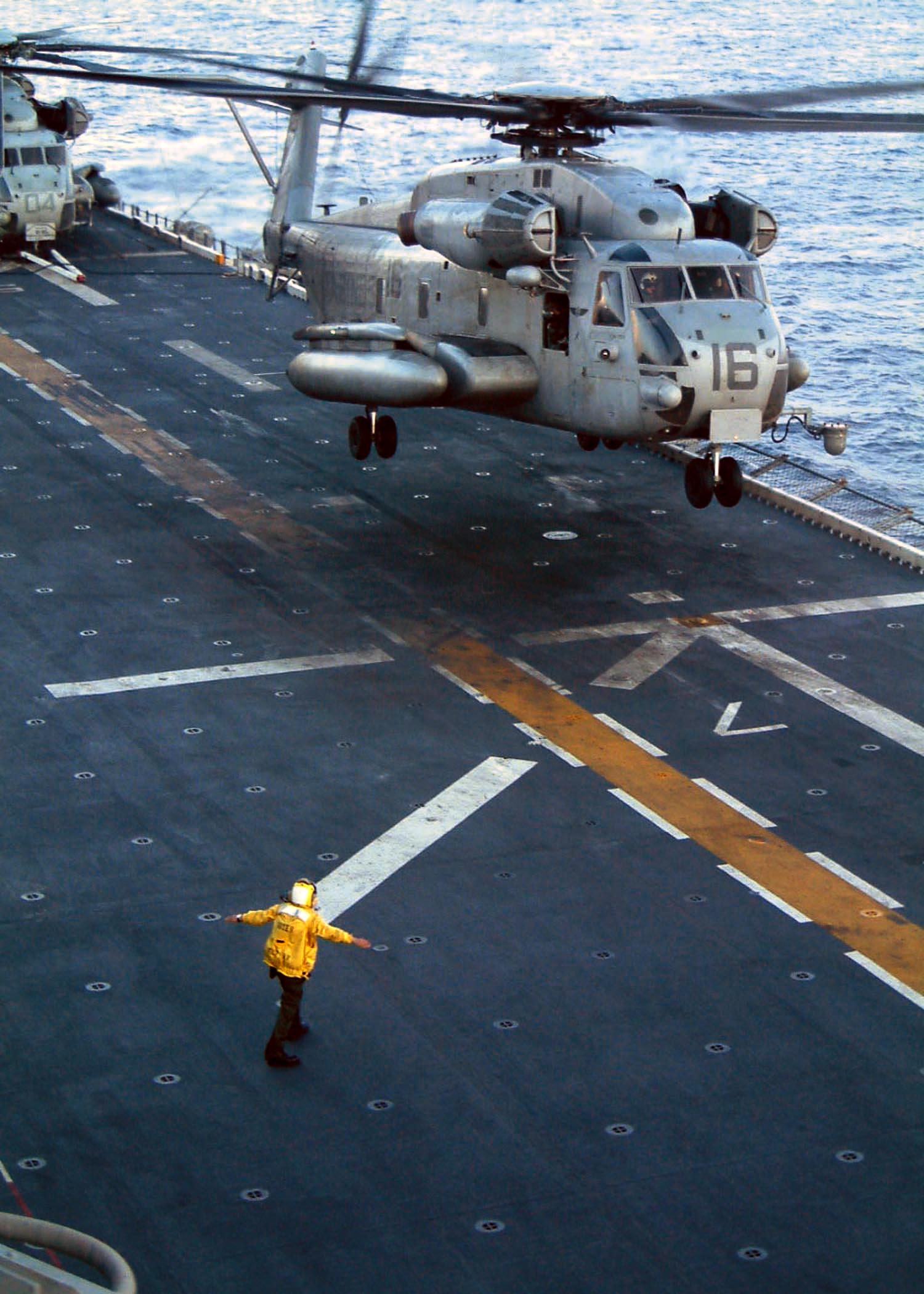 307k | A flight deck director signals a CH-53E Super Stallion helicopter to lift off the flight deck aboard USS Boxer (LHD4). Boxer and embarked Marines are deployed in support of Operation Enduring Freedom. US Navy photo # 030224-N-2321D-002 The Arabian Sea (Feb. 24, 2003) by SKC Denise Depozo. |