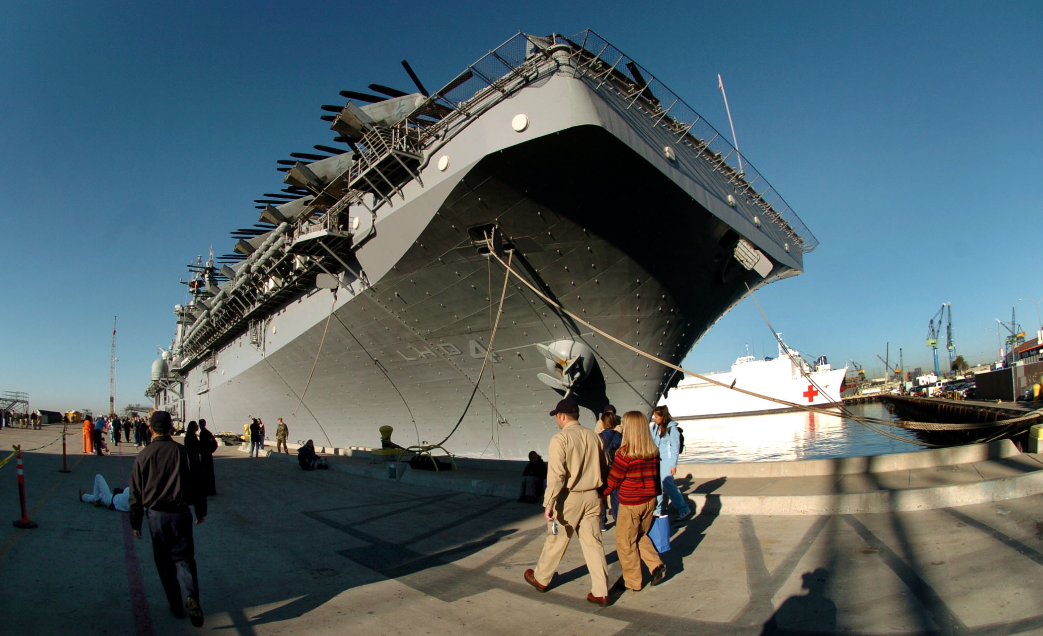 93k | USS Boxer (LHD-4) departs Naval Station San Diego, 14 March 2001, as family and friends gather at the end of Pier 2 to catch a last glimpse of loved ones manning the rails as the