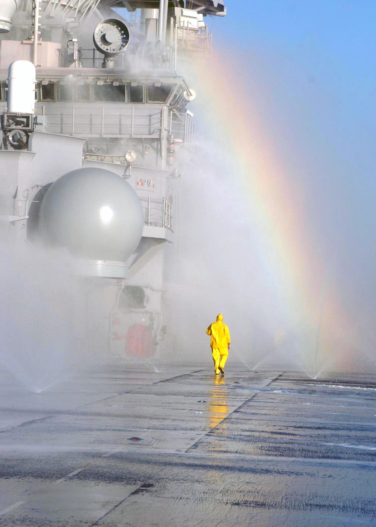 208k | A rainbow forms as a Sailor makes a final check of the Countermeasure Washdown System (CMWDS) on the flight deck of USS Boxer (LHD-4) The CMWDS provides a blanket of water protection to the exterior of a ship during a chemical, biological or radiological (CBR) attack. This shield of water washes CBR contaminants over the side before they can adhere to the ship’s surface or affect the crew. US Navy photo # 041206-N-3455P-008 Pacific Ocean (Dec. 6, 2004) by PHAN Rudy Polach. |