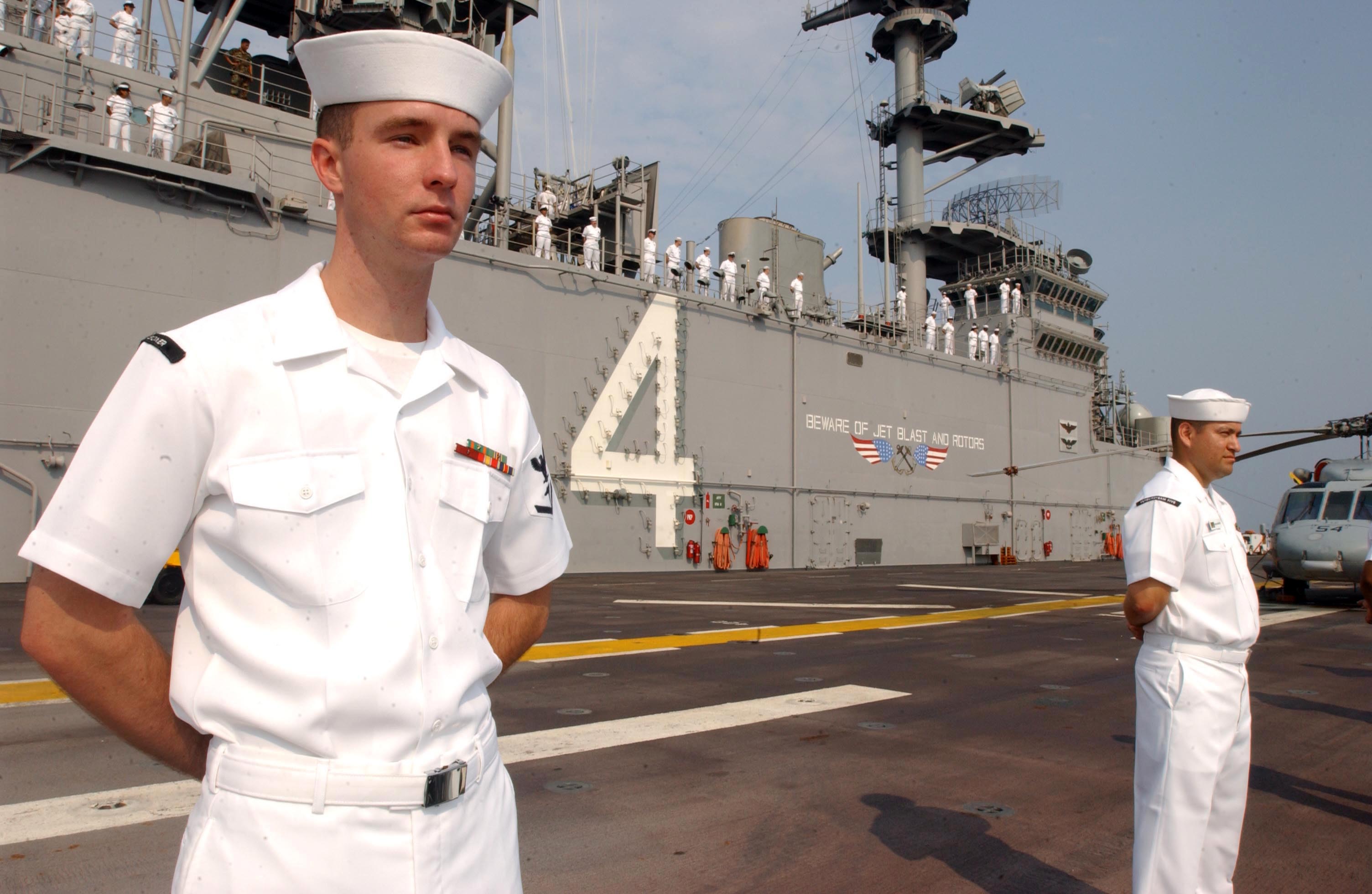 434k | Hospital Corpsman 3rd Class Christopher Gunn mans the rail as USS Boxer (LHD-4) pulls into Malaysia to take on personnel and stores in support of Cooperation Afloat Readiness and Training (CARAT). Boxer will be participating in the 11th edition of CARAT, which is a series of joint bilateral exercises held annually throughout Southeast Asia. US Navy photo # 050708-N-3455P-005 Malaysia (July 8, 2005) by PHAN Paul Polach. |
