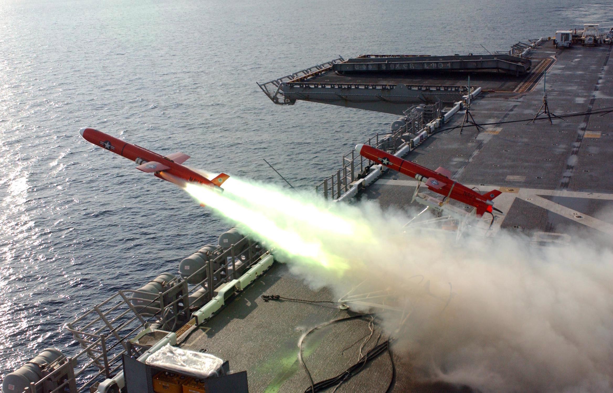 466k | A BQM-74E aerial target drone launches from the flight deck of USS Boxer (LHD-4) during exercise Cooperation Afloat Readiness and Training (CARAT) Malaysia. The BQM-74E provides dynamic airborne threat simulation and supports the Fleet worldwide. The target can simulate aircraft or cruise missiles in a variety of threat profiles. Malaysia is the 3rd phase of CARAT 2005, which is a regularly scheduled series of bilateral military training exercises with several Southeast Asia nations designed to enhance interoperability of the respective sea services. US Navy photo # 050713-N-3455P-003 South China Sea (July 13, 2005) by PHAN Paul Polach. |