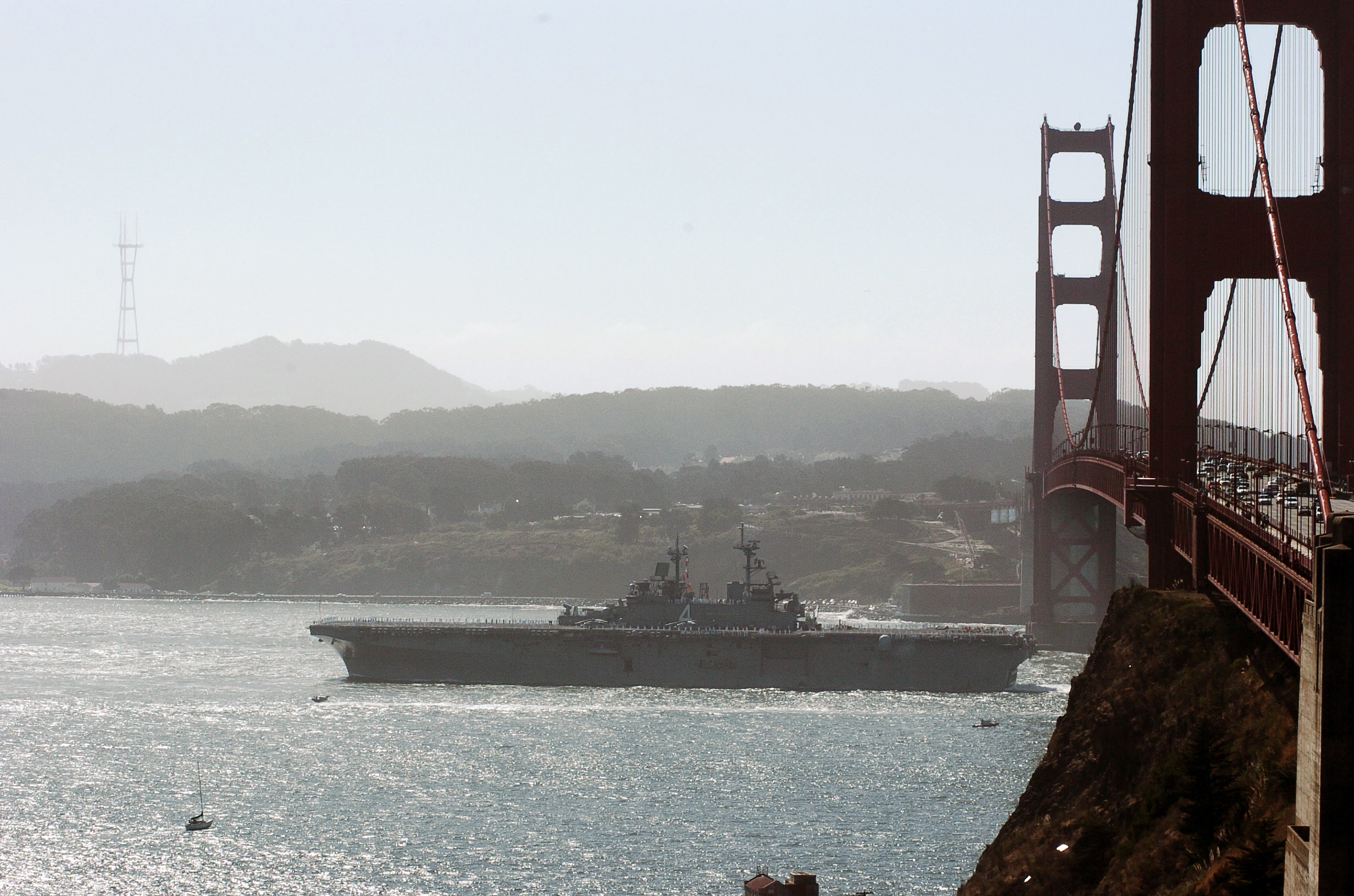1190k | USS Boxer (LHD-4) passes beneath the Golden Gate Bridge into San Francisco Bay as she participates in the 2005 San Francisco Fleet Week celebration. The 24th annual Fleet Week is a 5-day celebration held to recognize the contributions and sacrifices made by members of the Armed Forces. US Navy photo # 051008-N-6843I-026 San Francisco Bay (Oct. 8, 2005) by JOSN S. C. Irwin. |