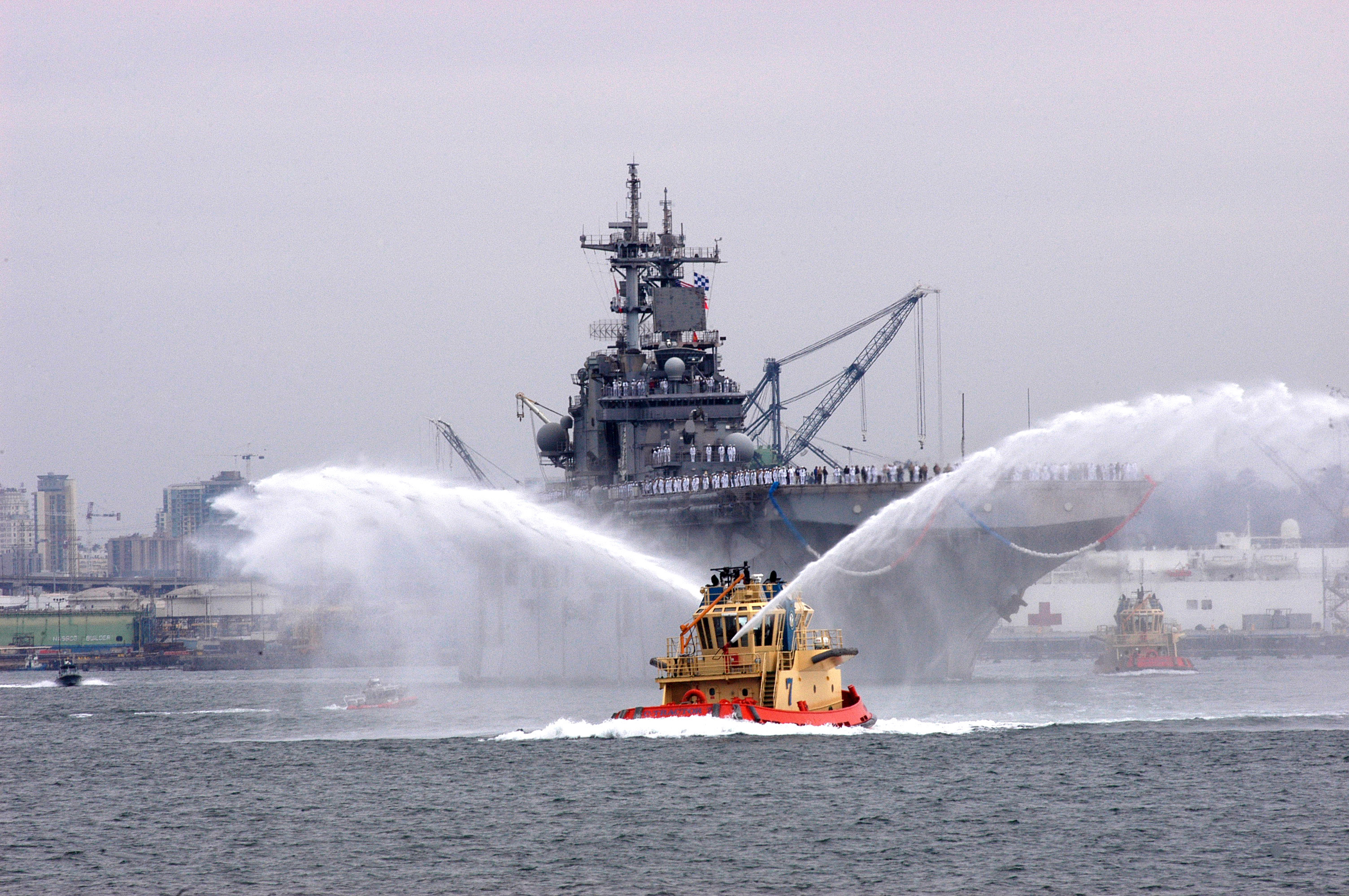 1897k | Tugboats spray arches of water in celebration of the arrival of USS Boxer (LHD-4) to her homeport at Naval Base San Diego. Boxer returned home from a twice-extended, nearly nine-month deployment in the Western Pacific US Navy photo # 070531-N-8327R-071 SAN DIEGO (May 31, 2007) by MCSN Michelle Rhonehouse. |