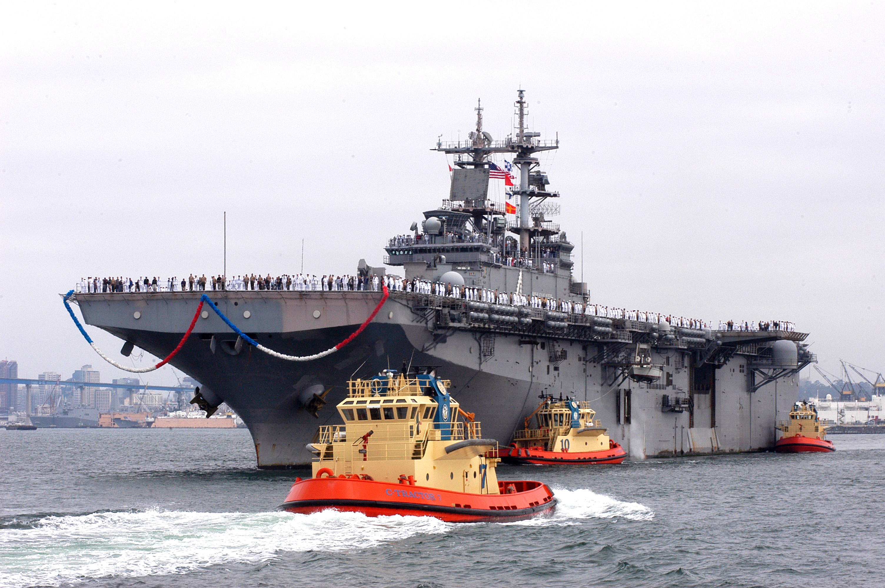 1467k | Sailors man the rails of USS Boxer (LHD-4) she prepares to moor at her home port of Naval Station San Diego. Boxer returned home from a twice-extended, nearly nine-month deployment in the Western Pacific. US Navy photo # 070531-N-8327R-071 SAN DIEGO (May 31, 2007) by MCSN Michelle Rhonehouse. |