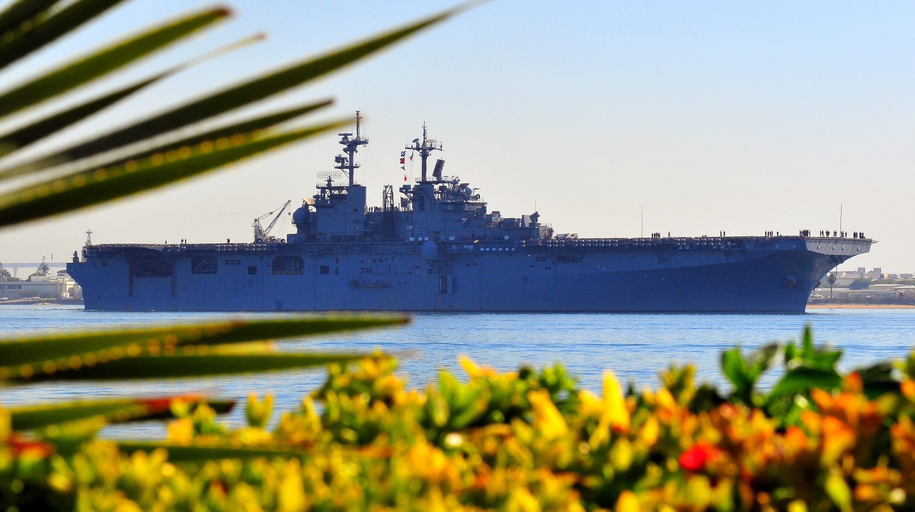 254k | Sailors and Marines man the rails on board USS Boxer (LHD-4) as she departs San Diego, 12 February 2016, for a deployment