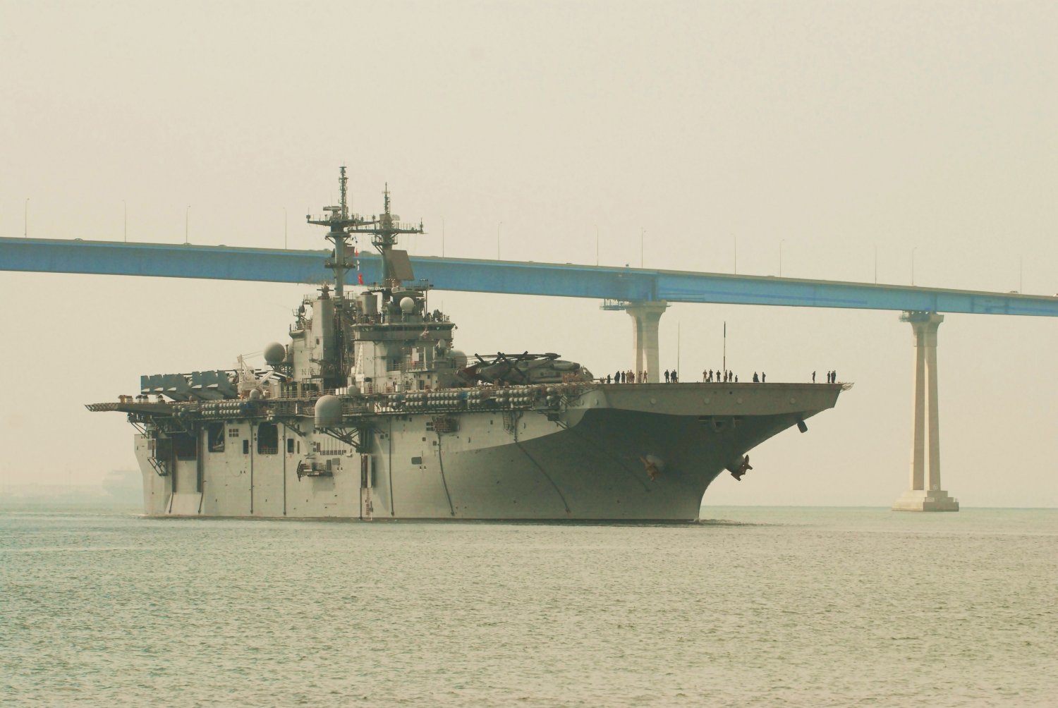 68k | USS Boxer (LHD-4) at San Diego, CA., 17 January 17 2003, loaded with U.S. Marines, as well as both medium and heavy lift helicopters; Boxer heads to sea for an unscheduled deployment in support of U.S. national interests. The amphibious assault ship is part of the seven-ship Amphibious Task Force West (ATF-W). US Navy photo # 030117-N-2069B-006 by PH3 Gregory Badger. |