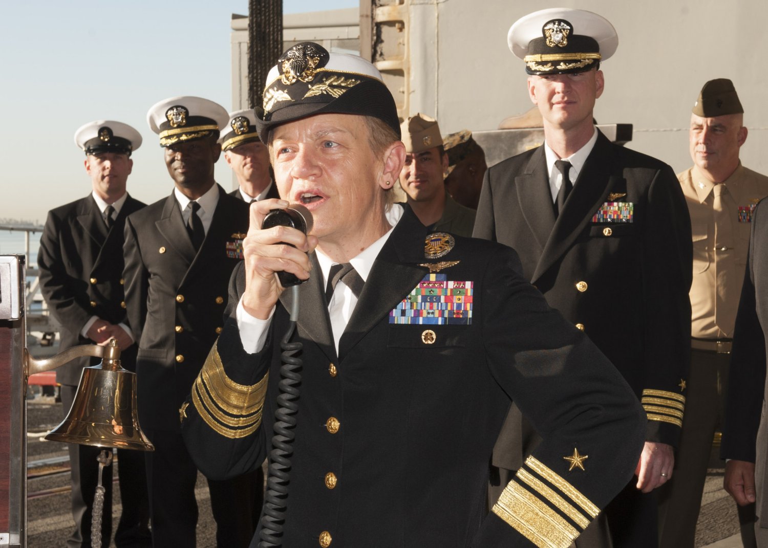 213k | Vice Adm. Nora Tyson, commander, U.S. 3rd Fleet, addresses the crew of USS Boxer (LHD-4) prior to the ship departing for a