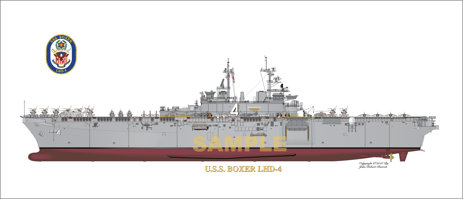 248k | Artist's conception of USS Boxer (LHD-4) by graphic illustrator John Barrett. His company, Navy Yard Associates offers, prints of many other navy types including most destroyers, destroyer escorts, submarines and aircraft carriers in various configurations during the ship's lifetime. The prints can be customized with ship's patches, your photograph, your biography, etc. If you decide to purchase artwork from them please indicate that you heard about their work from NavSource. | Navy Yard Associates | |