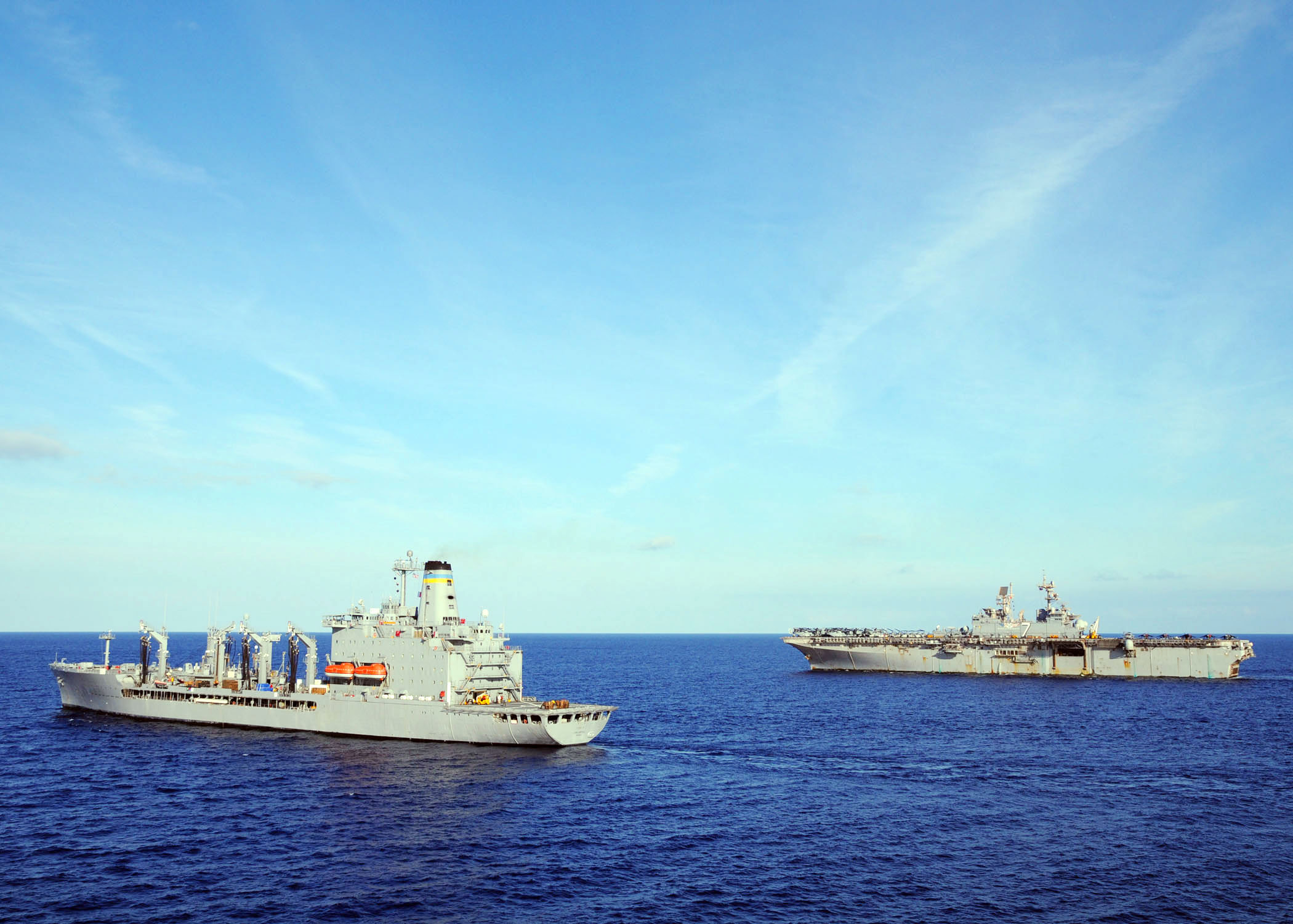 (T-AKE-4), center, as she conducts an underway replenishment with USS Iwo Jima (LHD-7.
