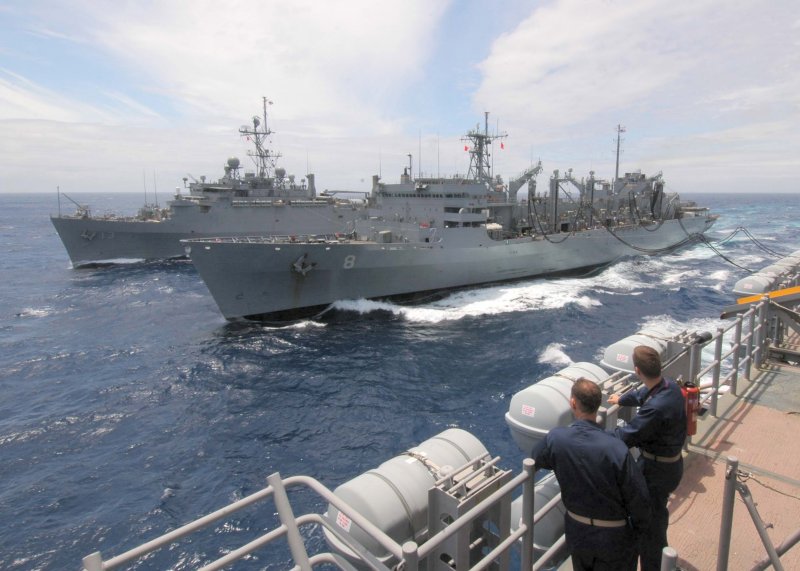 (DDG-51) prepares to come alongside the dry cargo and ammunition ship USNS Richard E. Byrd