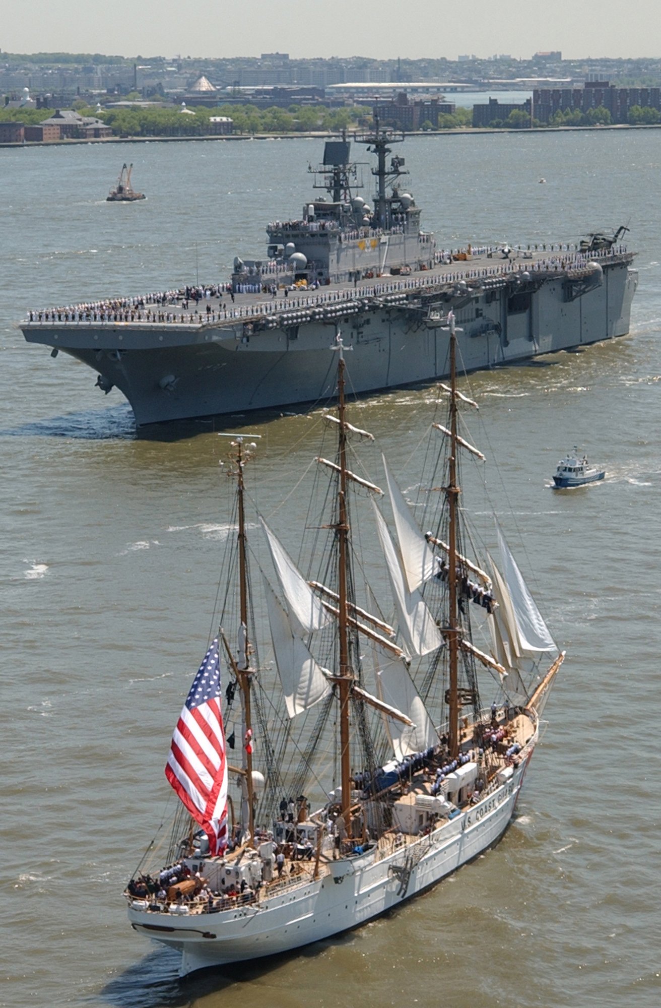 459k | USCG Cutter Eagle passes USS Iwo Jima (LHD-7) on the Hudson River during Fleet Week 2002 in New York Harbor, 22 May 2002. US Navy photo # 1-HR-020522-N-3235P-513 for the Navy Newsstand web site |