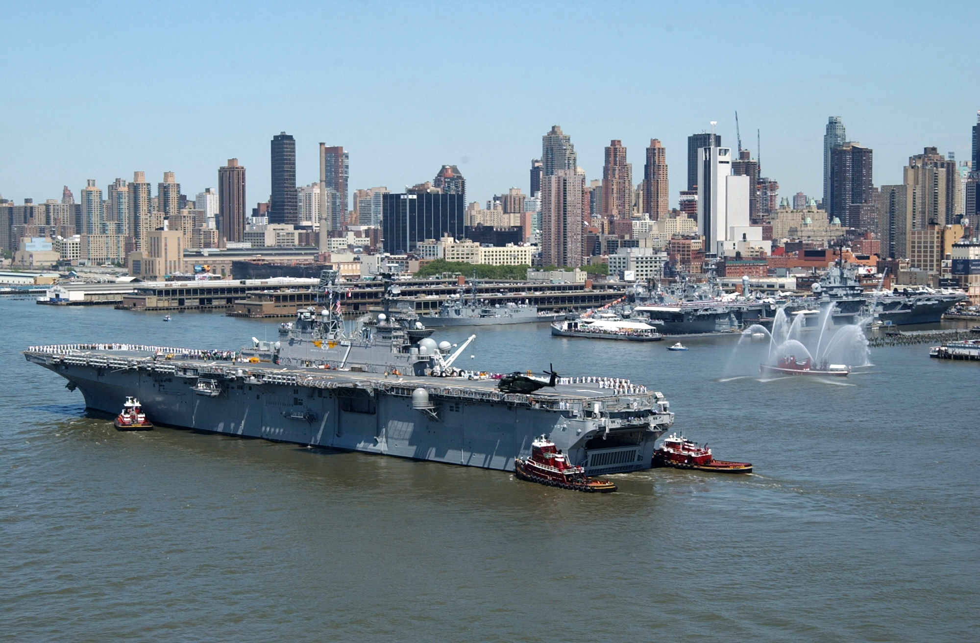 1722k | USS Iwo Jima (LHD-7) pulls into Pier-88 after sailing up the Hudson River to kick off Fleet Week 2002 in New York City. More