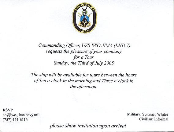Invitation to tour USS Iwo Jima (LHD-7) while on a port visit to Portland, ME., 3 July 2005. |
