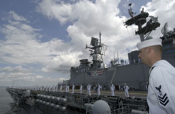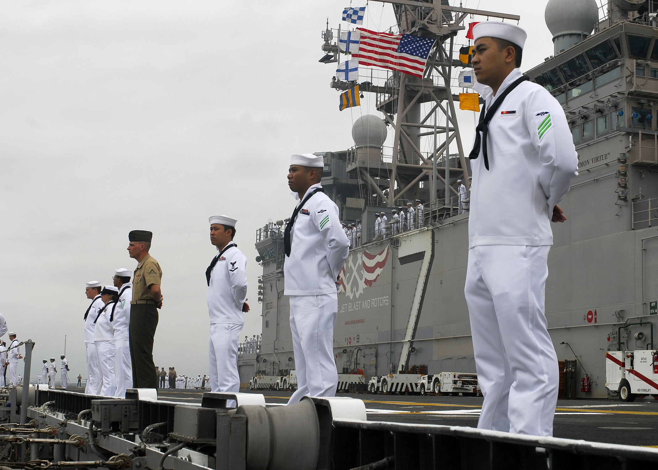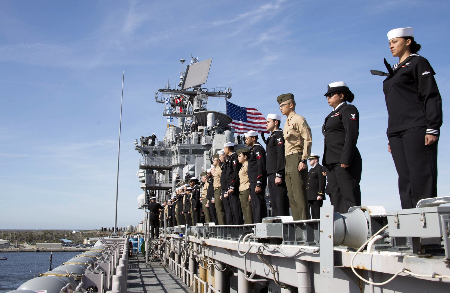 Sailors and Marines man the rails on the flight deck of USS Iwo Jima (LHD-7) as she departs Naval Station Mayport for a