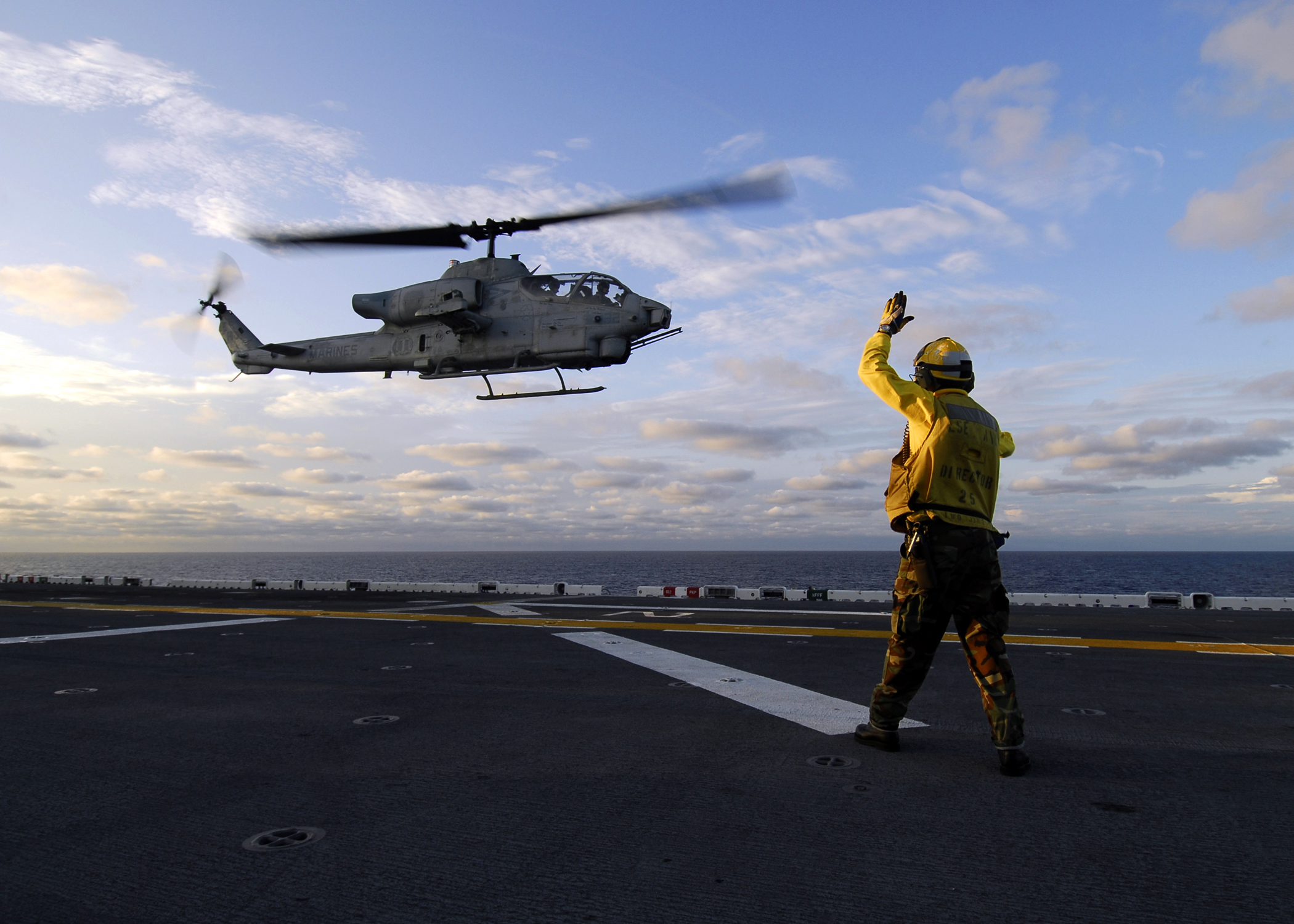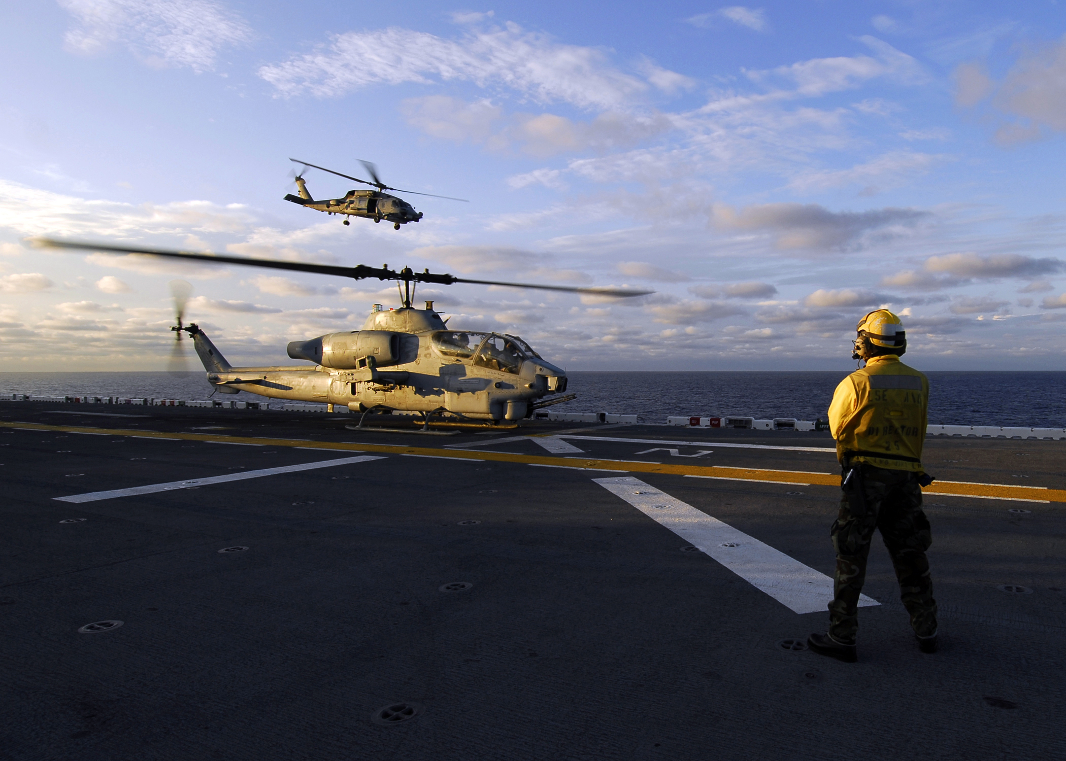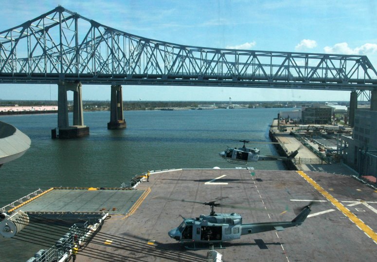US Marine Corps UH-1N Huey helicopters conduct flight operations from the deck of USS Iwo Jima (LHD 7), 6 September 2005. Iwo Jima in the port of New Orleans serving as the command and control center for Joint Task Force Katrina, the combined military effort to provide aid for the areas hit by Hurricane Katrina. The Navy's involvement in the Hurricane Katrina humanitarian assistance operations is led by the Federal Emergency Management Agency (FEMA), in conjunction with the Department of Defense. |