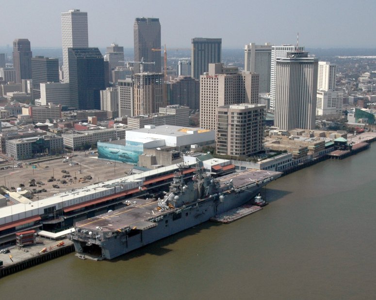 USS Iwo Jima (LHD 7), sits pier side in New Orleans in support of Hurricane Katrina humanitarian assistance operations, 10 September 2005. |