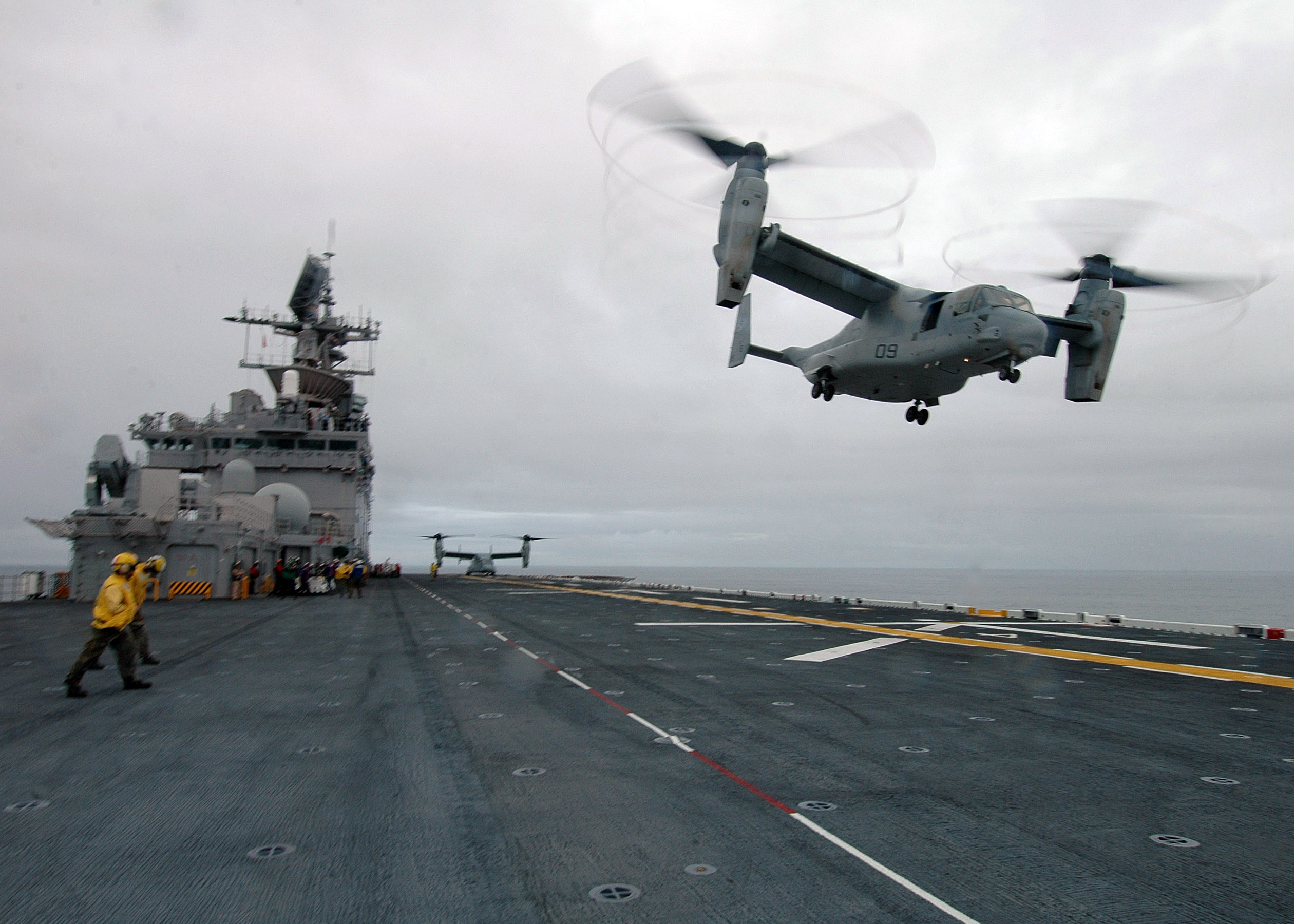 Aviation Boatswain’s Mates watch a V-22 Osprey as it lifts off from the flight deck of USS Iwo Jima (LHD 7), 27 September 2007. |