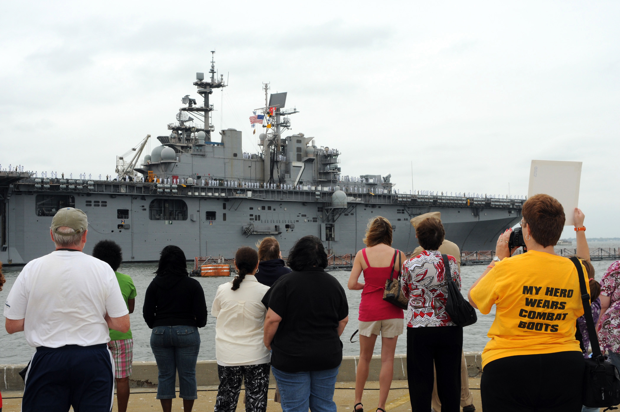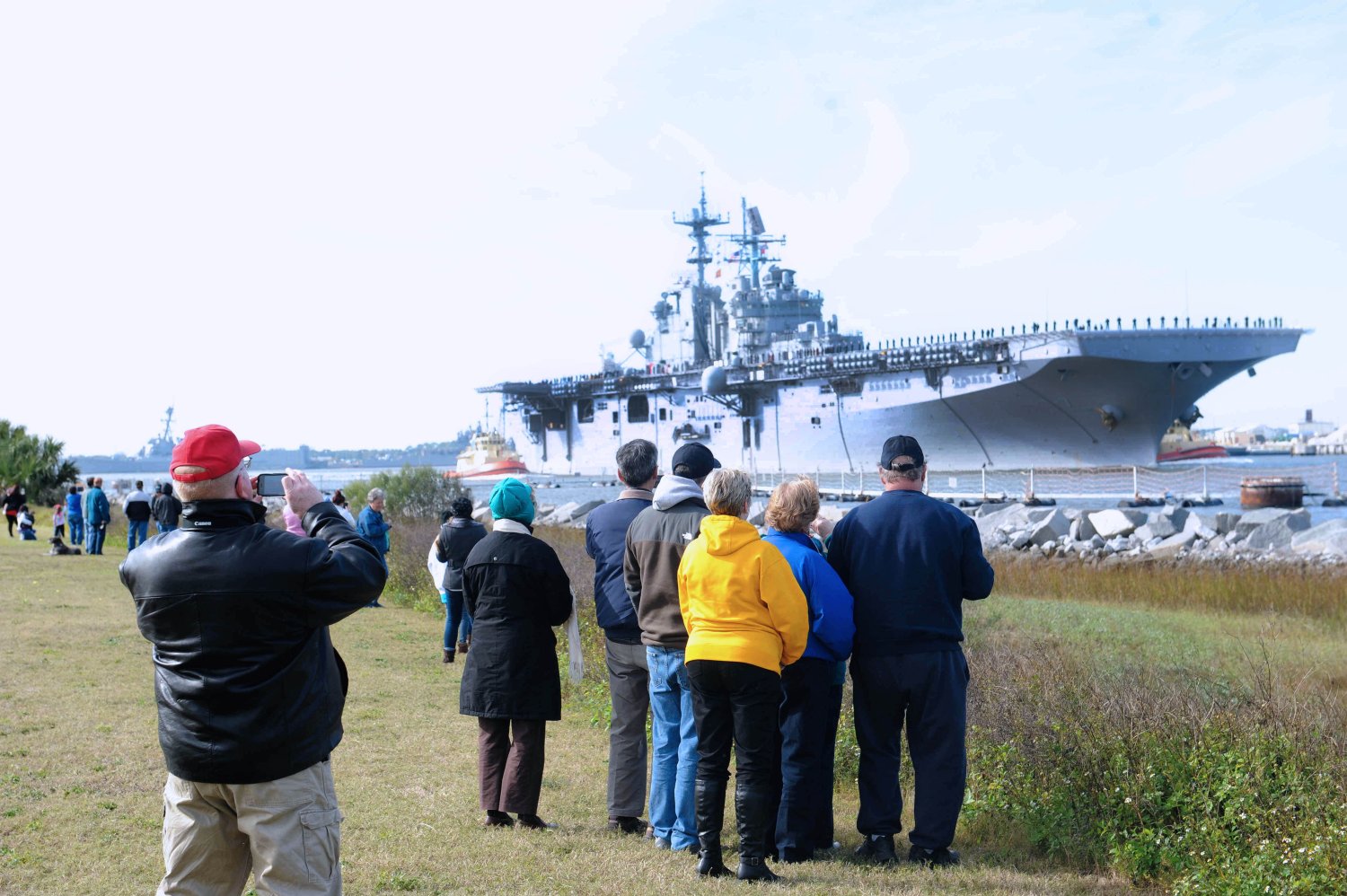 Family and friends stand on the pier at Naval Station Norfolk as they watch USS Iwo Jima (LHD-7) depart for a regularly scheduled deployment in support of maritime security operations and theater security cooperation efforts in the US 5th and 6th Fleet areas of responsibility. |