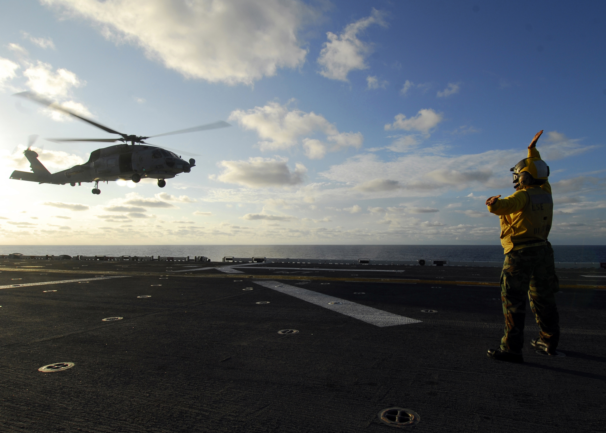 An SH-60 Seahawk helicopter flies near the ship during a Capability Exercise with the guided missile cruiser
