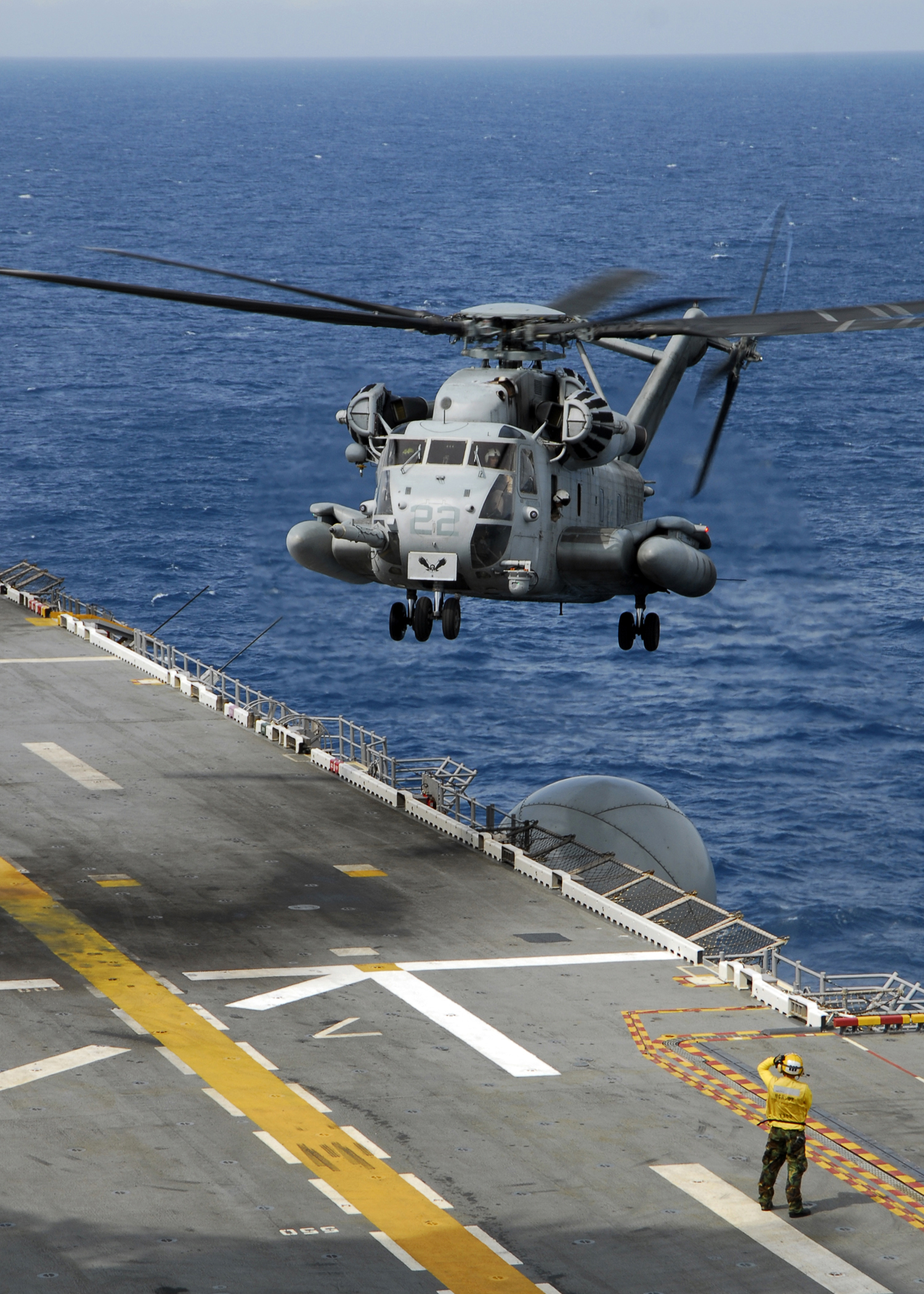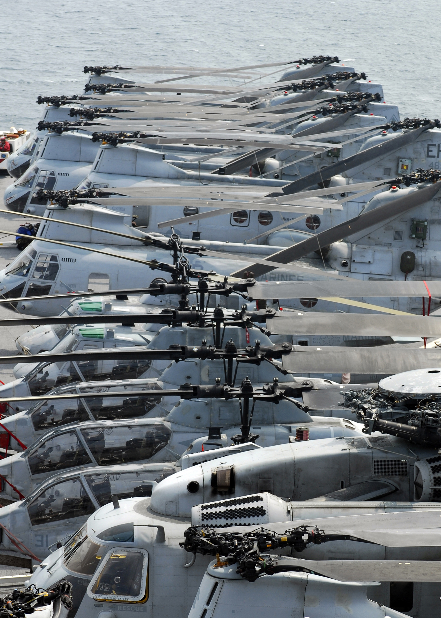 Helicopters from Marine Medium Helicopter Squadron-264 (HMM-264) line the flight deck of USS Iwo Jima (LHD-7), 28 August 2008. Iwo Jima, the flagship of the Iwo Jima Expeditionary Strike Group, is on a scheduled deployment en route to the U.S. 5th and 6th Fleet areas of responsibility supporting maritime security operations. |