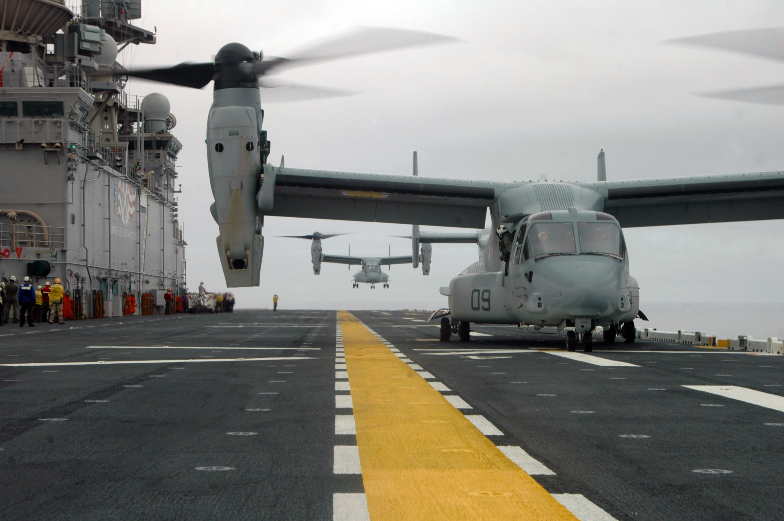 Two V-22 Ospreys touch down on the flight deck of USS Iwo Jima (LHD-7), 27 September 2007. |