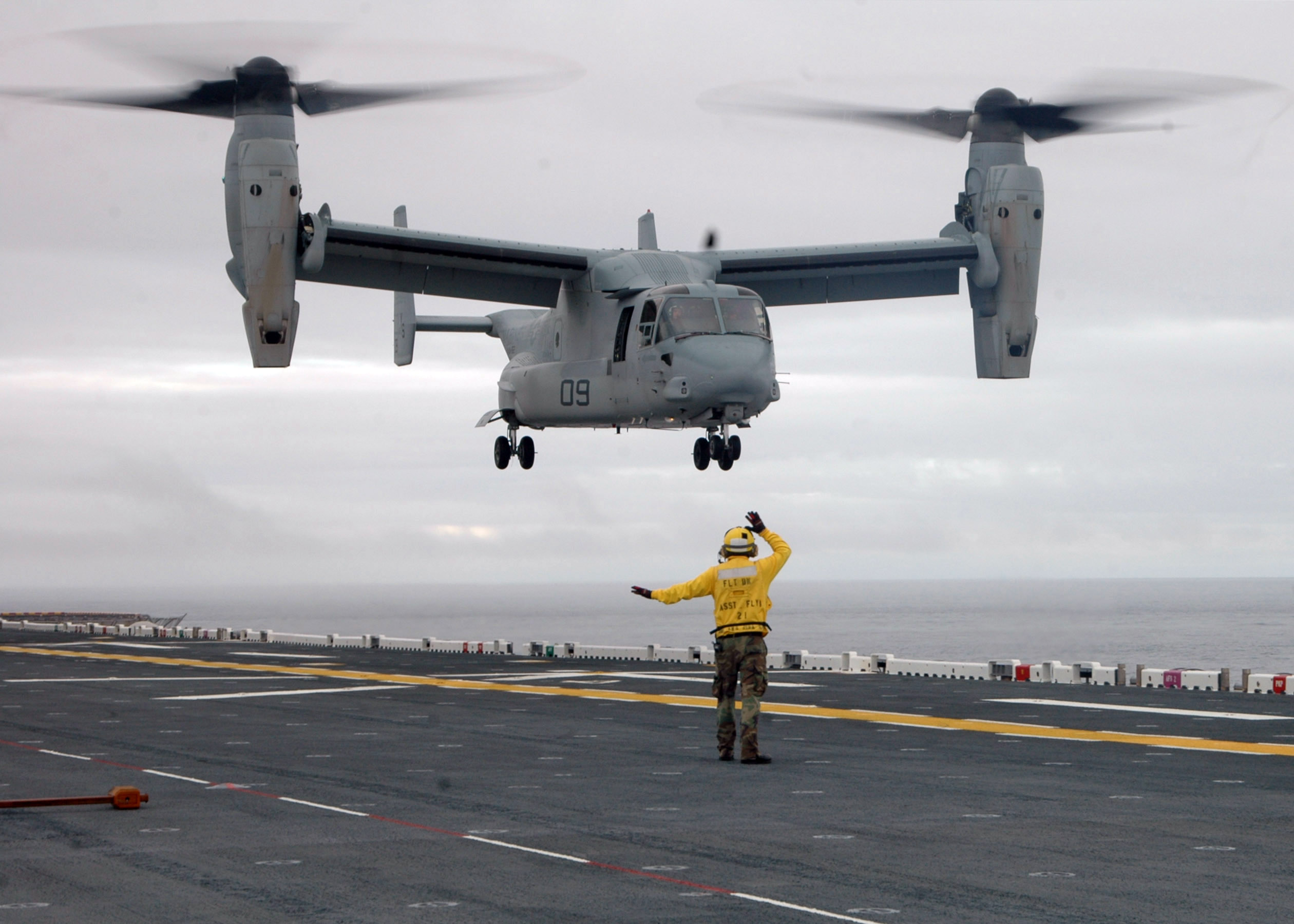 A "yellow shirt" aircraft director conducts a landing of a V-22 Osprey aboard USS Iwo Jima (LHD-7), 27 September 2007. This is the first time Iwo Jima has conducted operations with the V-22 Osprey in more than two years. |