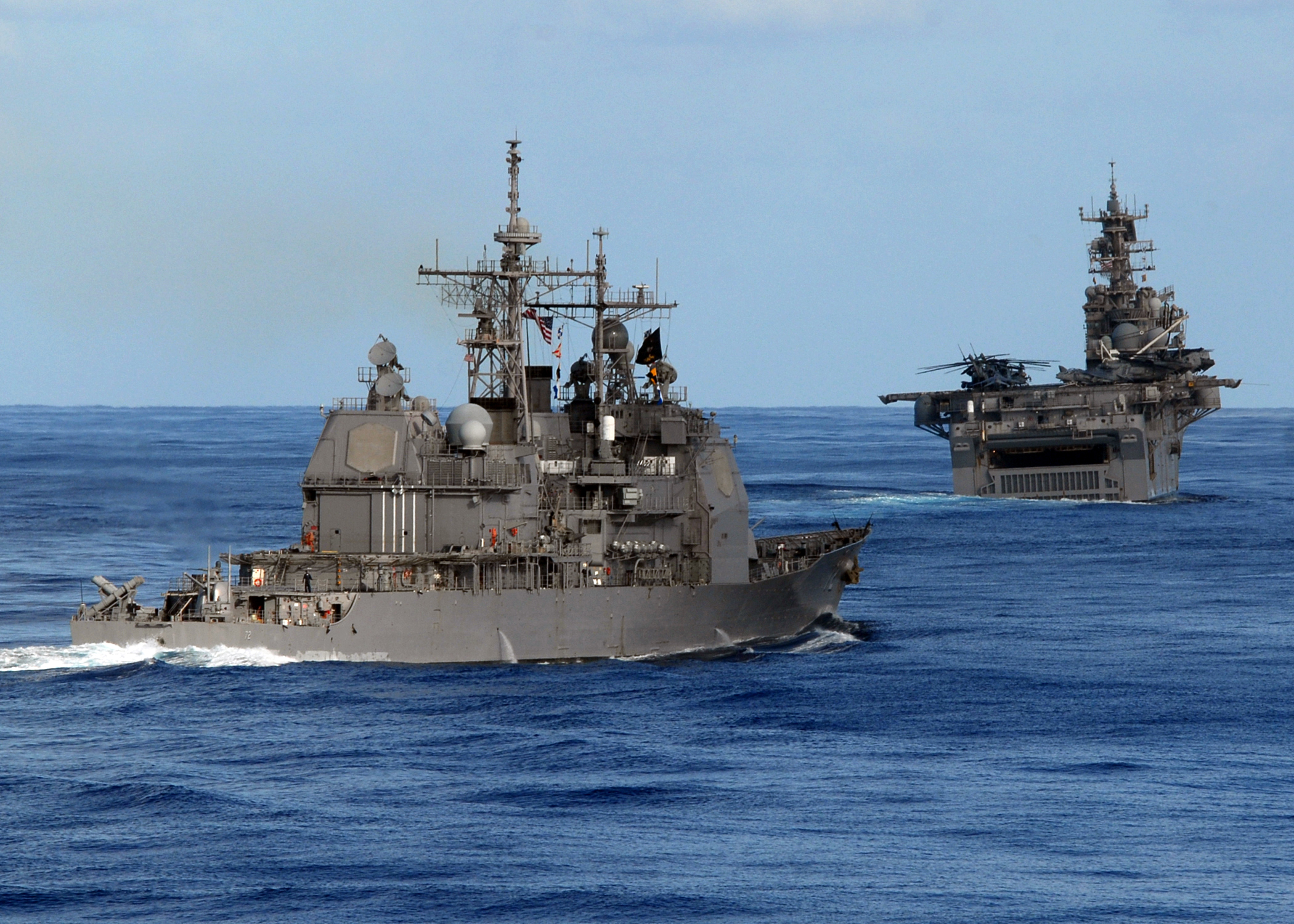 USS Iwo Jima (LHD 7) steams in formation, followed by the amphibious transport dock ship USS San Antonio (LPD-17), for a straits transit exercise during the Iwo Jima Expeditionary Strike Group composite unit training exercise (COMPTUEX). COMPTUEX provides a realistic training environment to ensure the strike group is capable and ready for its upcoming scheduled deployment. |