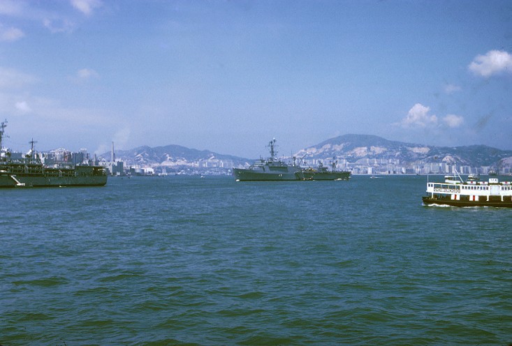 85k | USS Cleveland (LPD-7), at Hong Kong, in 1969, with a partial view of USS Catskill (MCS-1) at left. | Photo by Larry Lee | |