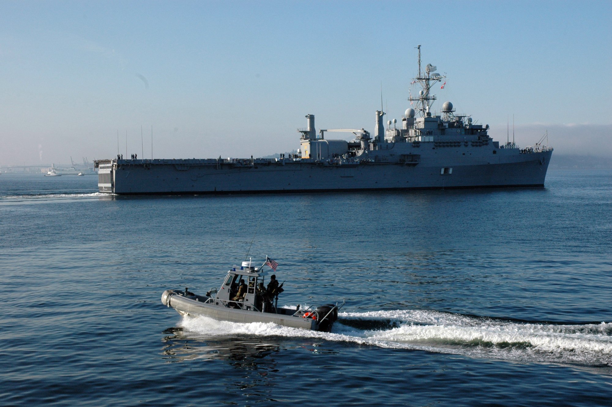 438k | A mobile security detachment boat escorts USS Cleveland (LPD 7) away from the pier following her involvement in the 57th annual Seattle Seafair, 7 August 2006. Seafair is Seattle's month-long traditional summer festival, which includes parades, amateur athletics, air shows and boat racing. US Navy photo # 060807-N-0763C-004 Seattle, Wash. (Aug. 7, 2006) by MC3 Tara Cornett. |