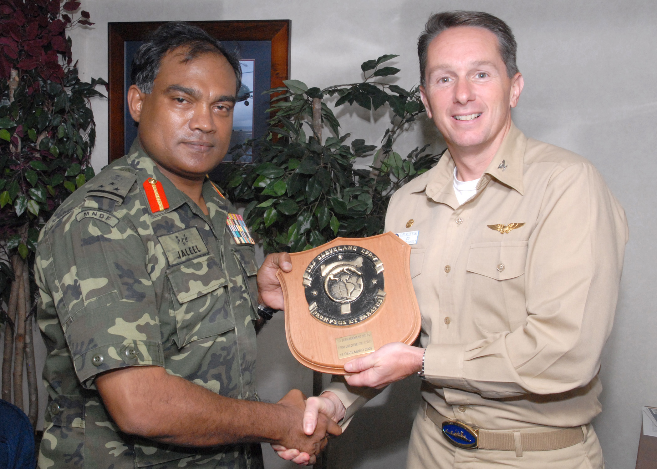 737k | Indian Ocean, 18 December 2007. CAPT. Billy Hart, USS Cleveland (LPD-7)'s commanding officer, presents a plaque to Brigadier General Moosa Ali Jaleel, Commanding General of Maldives National Defense Force's Quick Reaction Force. Marines from the Combined Logistics Battalion (CLB 11) and Cleveland's medical personnel are participating in Coconut Grove, an exercise to enhance capabilities and interoperability between US forces and MNDF. Cleveland, embarked with Marines from CLB 11, is currently assigned to the Tarawa Expeditionary Strike Group (ESG) and is on a scheduled deployment to the 5th and 7th Fleet areas of responsibility. US Navy photo by MC1(AW) Grant P. Ammon. |
