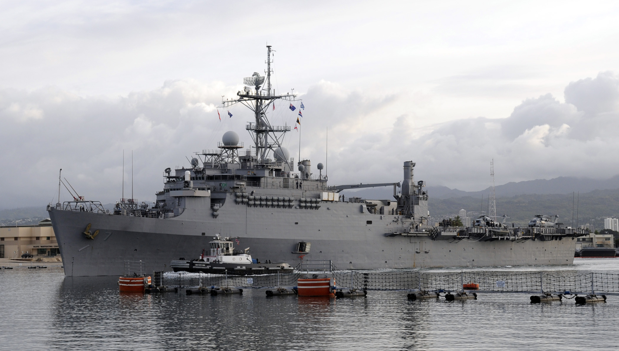 167k | U.S. Navy ships laid up in reserve in Middle Loch, Pearl Harbor, Hawaii, as of 1 July 2016. Identifiable ships are (front to back): Amphibious Assault Ship USS Peleliu (LHA-5), Guided Missile Frigate USS McClusky (FFG-41), Guided Missile Frigate USS Vandegrift (FFG-48), Amphibious Assault Ship USS Tarawa (LHA-1), Guided Missile Frigate USS Crommelin (FFG-37), Guided Missile Frigate USS Curts (FFG-38), Guided Missile Frigate USS Thach (FFG-43), Guided Missile Frigate USS Rentz (FFG-46), Landing Ship Tank USS Racine (LST-1191), Dock Landing Ship USS Cleveland (LPD-7), Dock Landing Ship USS Denver (LPD-9), Dock Landing Ship USS Juneau (LPD-10); Amphibious Cargo Ship USS Durham (LKA-114) and Amphibious Cargo Ship USS St. Louis (LKA-116). US Navy photo # 160701-N-SI773-264 Pearl Harbor, July 16, 2001 by MC1 Ace Rheaume, USN. |