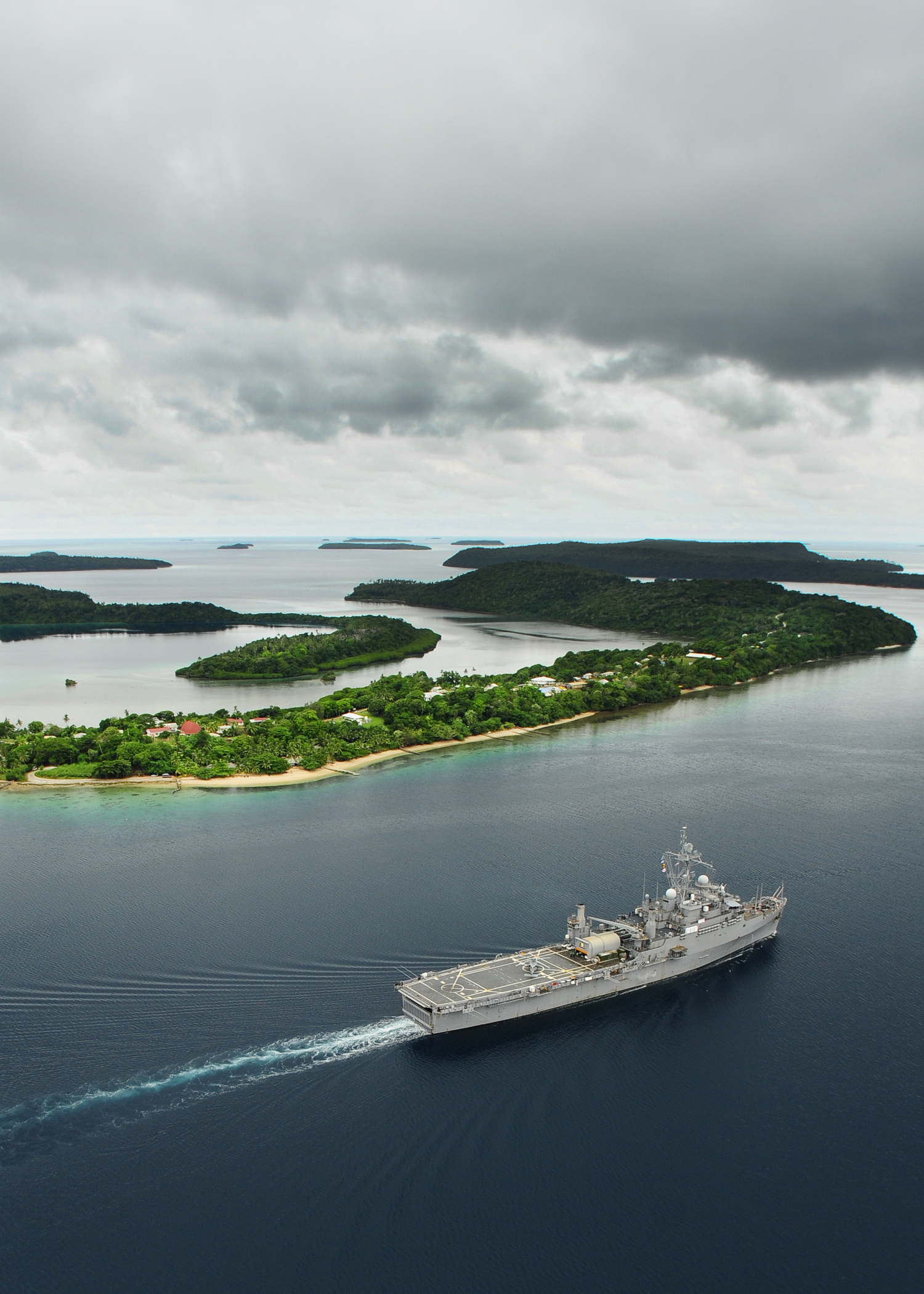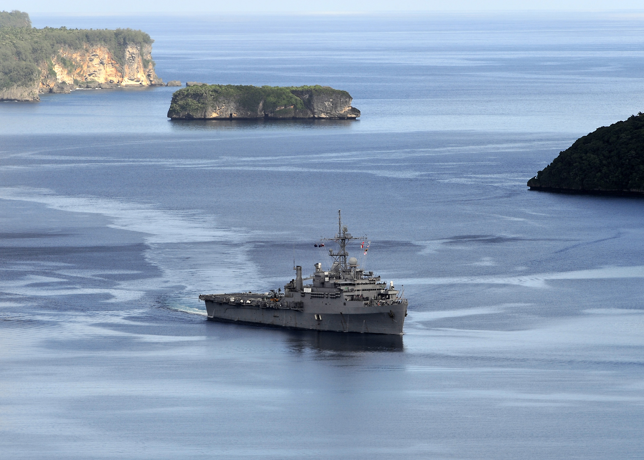 1899k | USS Cleveland (LPD-7) pulls out of Tonga after completing the first mission of Pacific Partnership 2011. US Navy photo # 110423-N-BC134-366 PACIFIC OCEAN (April 23, 2011) by MCSN John Grandin. |