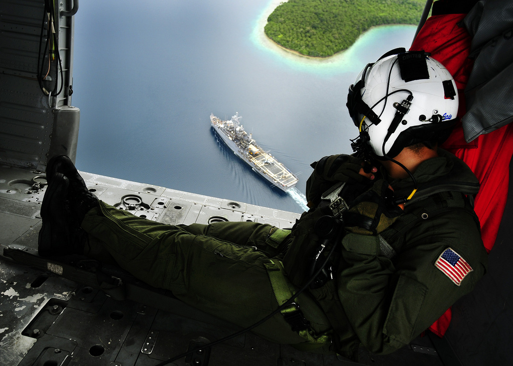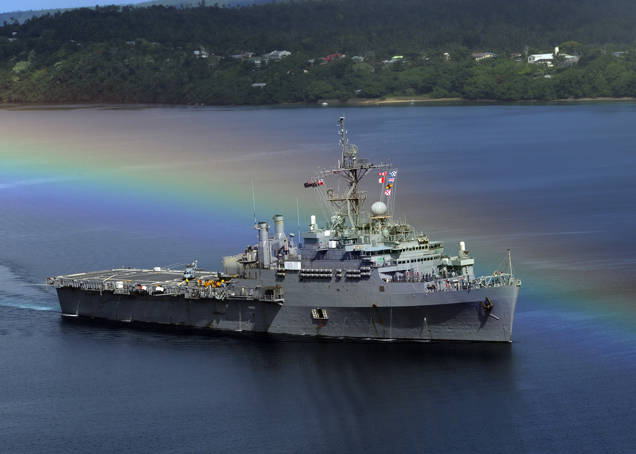 353k | Naval Air Crewman 2nd Class Bowen Derik attached to Helicopter Sea Combat Squadron 23 (HSC-23) "Wild Cards" watches USS Cleveland (LPD-7) as she pulls out of Tonga, 23 April 2011, after completing the first mission of Pacific Partnership 2011. Pacific Partnership is a five-month humanitarian assistance initiative that will make port visits to Tonga, Vanuatu, Papua New Guinea, Timor-Leste, and the Federated States of Micronesia. US Navy photo # 110423-N-BC134-321 PACIFIC OCEAN (April 23, 2011) by MCSN John Grandin. |