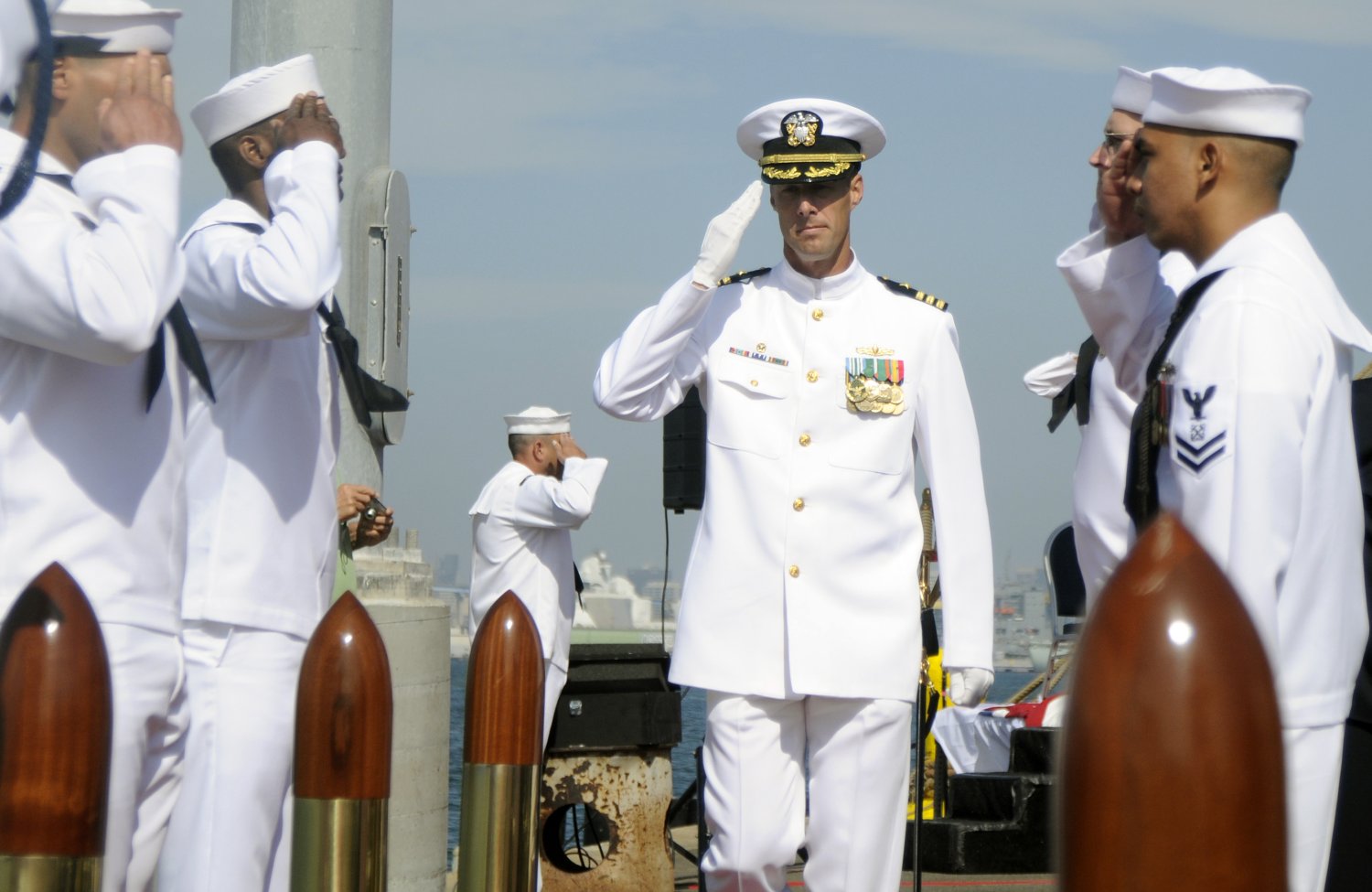 160k | CDR. Christopher J. Kipp, commanding officer of USS Cleveland (LPD-7), gives a final salute during the decommissioning ceremony for Cleveland at Naval Base San Diego. Cleveland was decommissioned after 44 years of Naval service. US Navy photo # 110930-N-UM054-167 SAN DIEGO (Sept. 30, 2011) by EMFN Yasmine Muhammad |