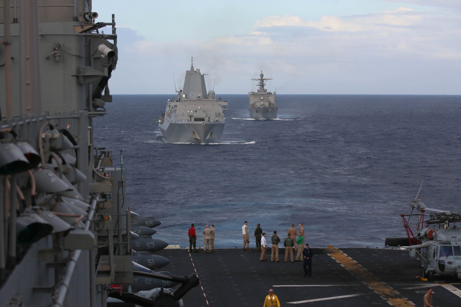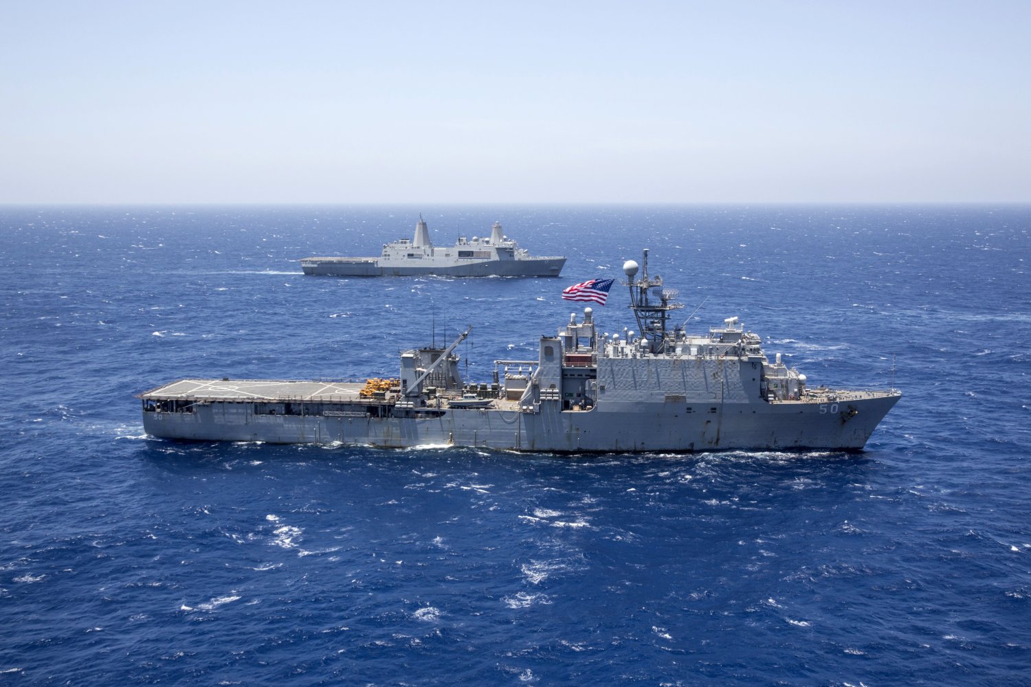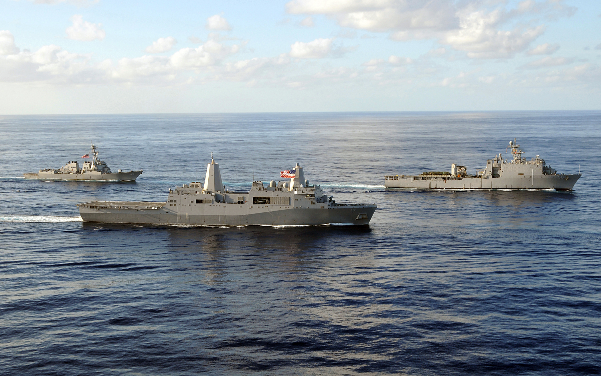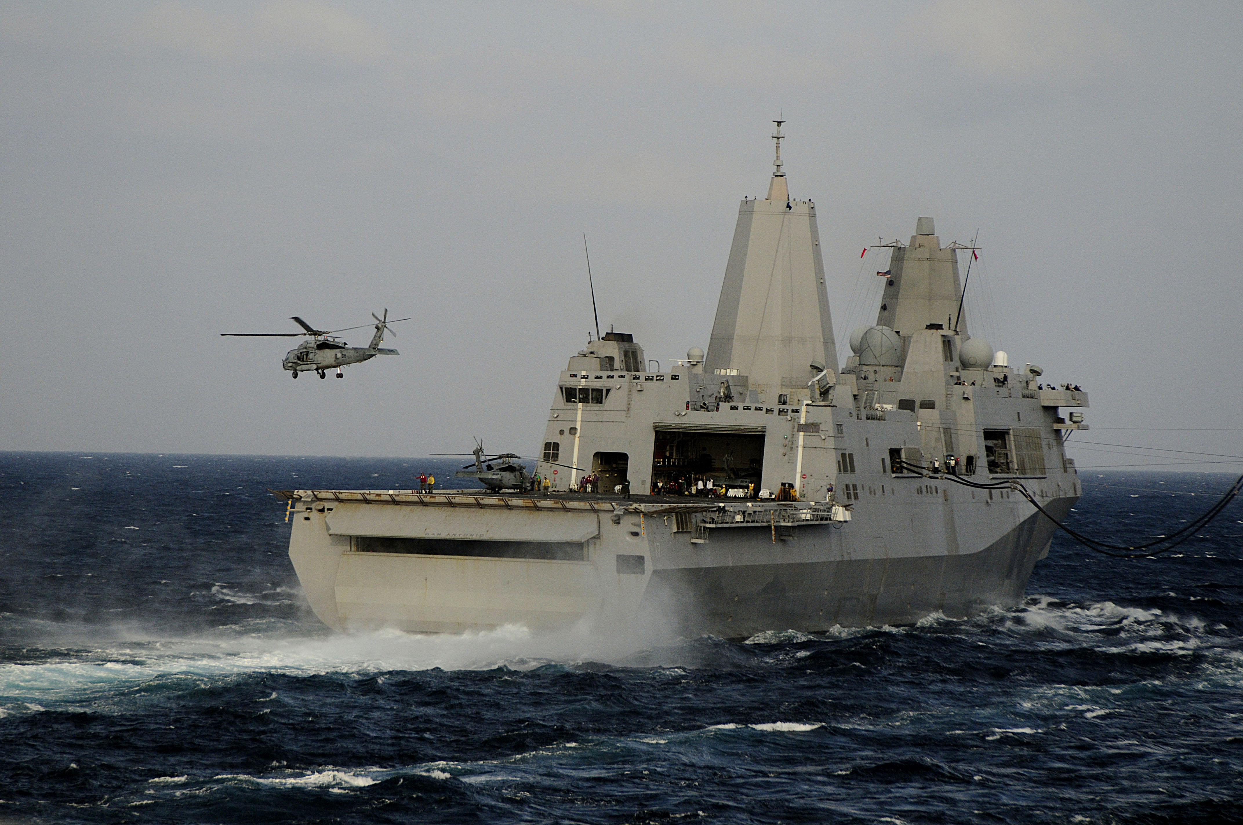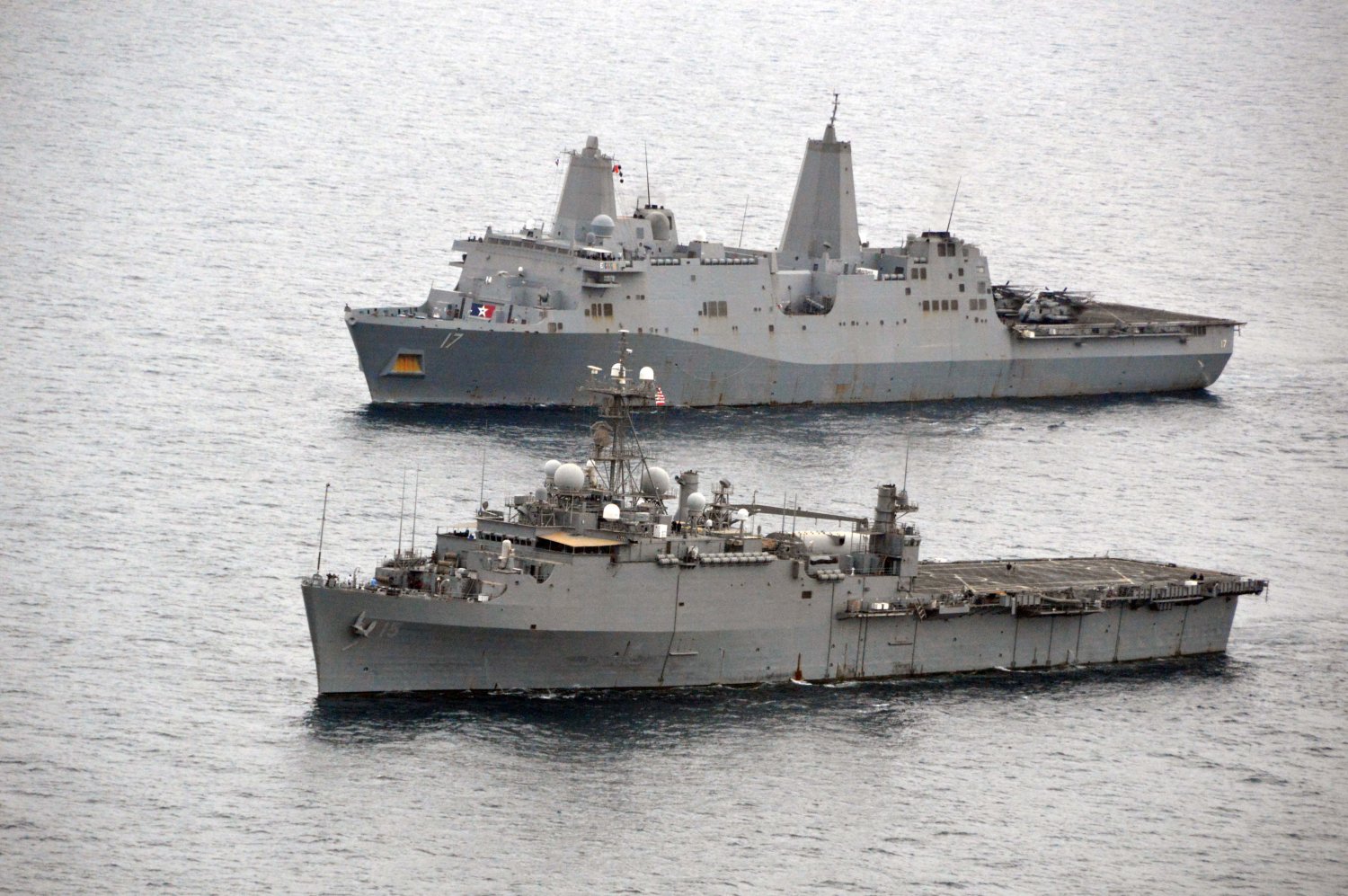 268k | The amphibious assault ship USS Kearsarge (LHD-3) and USS San Antonio (LPD-17), both part of the Kearsarge Amphibious Ready group, are underway in formation. The group is deployed in support of maritime security operations and theater security cooperation efforts in the U.S. 5th Fleet area of responsibility. US Navy photos # 130616-N-SB587-102 RED SEA (June 16, 2013) by MC2 Corbin J. Shea. | Lee Wahler | |