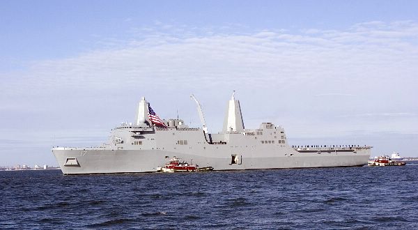 395k | USS San Antonio (LPD-17) outbound to sea from Norfolk, VA., 28 August 2008 as part of the Iwo Jima Expeditionary Strike Group (IWO ESG) supporting maritime security operations and theater security cooperation efforts in the U.S. 5th and 6th Fleet areas of responsibility. US Navy photo # 080828-N-9985W-039 NORFOLK, Va. (Aug. 28. 2008) by MCSN Tyler J. Wilson. |