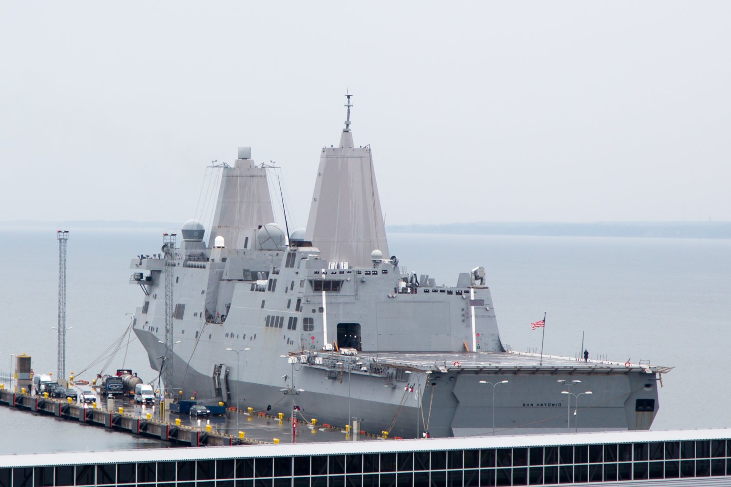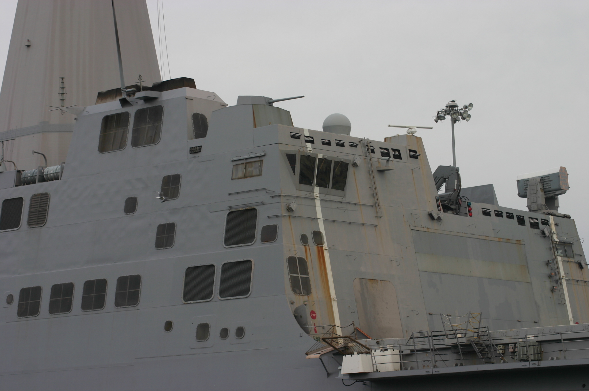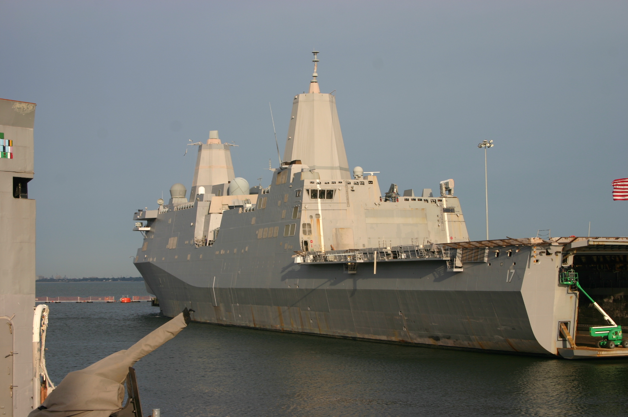 848k | USS San Antonio (LPD-17) moored at NavSta Norfolk as her sister ship USS Mesa Verde (LPD-19) gets underway. Mesa Verde is part of the Bataan Amphibious Ready Group and was deploying ahead of its original schedule in order to relieve units from the Kearsage Amphibious Ready Group in the Mediterranean Sea.. US Navy photo # 110323-N-QY430-084 NORFOLK (March 23, 2011) by MC2 Rafael Martie |