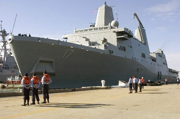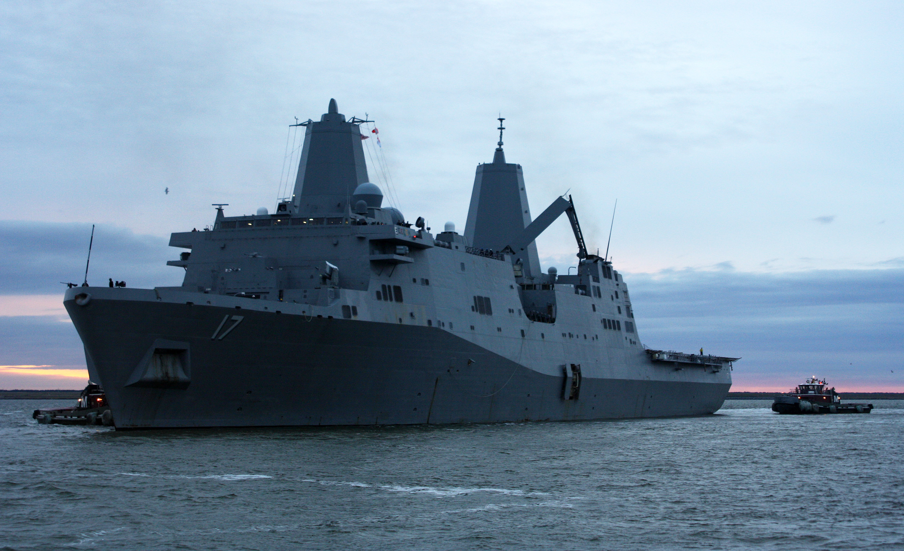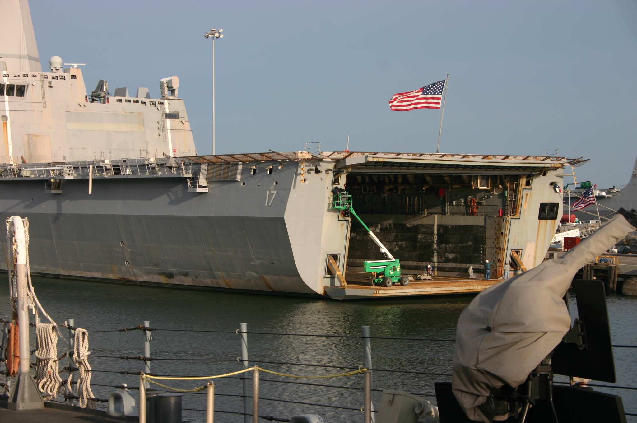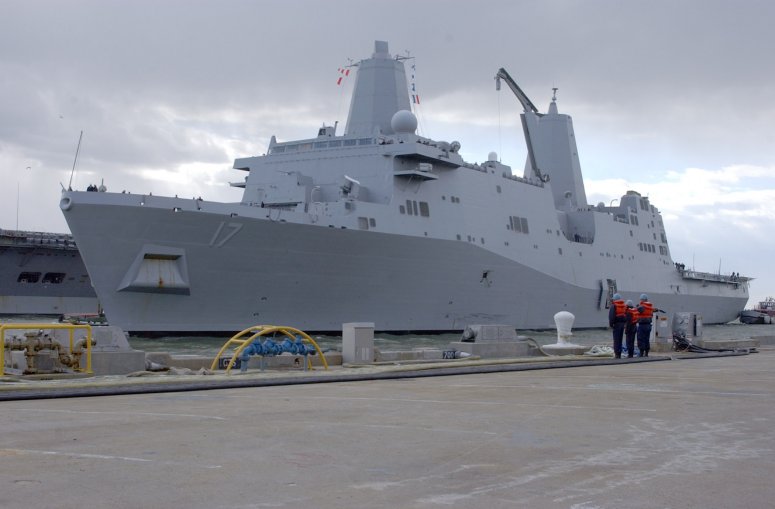 848k | USS San Antonio (LPD-17) moored at NavSta Norfolk as her sister ship USS Mesa Verde (LPD-19) gets underway. Mesa Verde is part of the Bataan Amphibious Ready Group and was deploying ahead of its original schedule in order to relieve units from the Kearsage Amphibious Ready Group in the Mediterranean Sea.. US Navy photo # 110323-N-QY430-084 NORFOLK (March 23, 2011) by MC2 Rafael Martie |