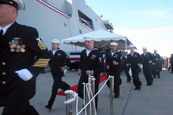 46k | Sailors assigned to USS San Antonio (LPD 17) man the ship, 14 January 2006, officially bringing her to life, during her commissioning ceremony held on board Naval Station Ingleside. Under Navy tradition, Sailors charge aboard the ship, and man the rails signifying ownership. US Navy photo # 060114-N-0191T-201. |