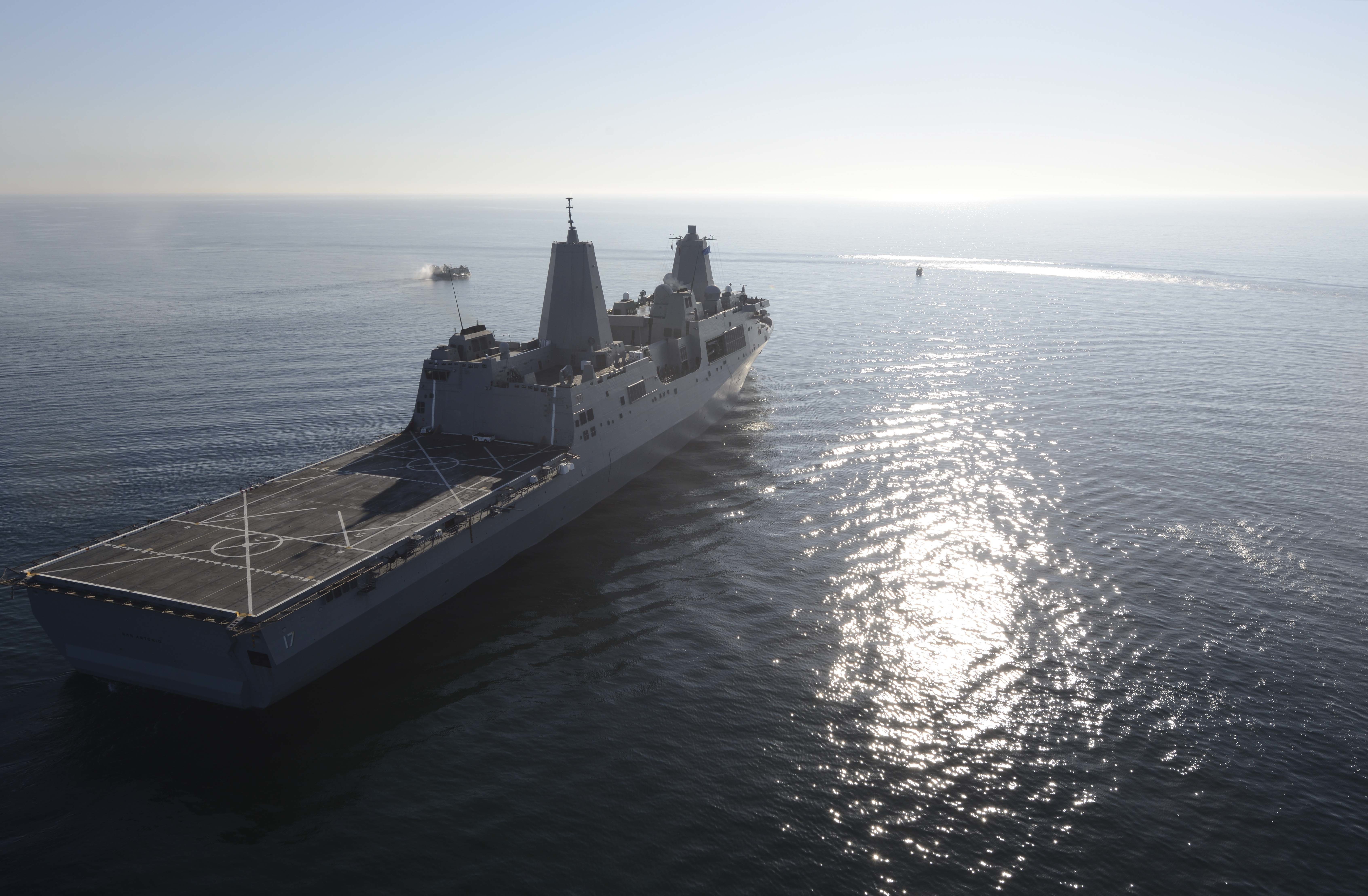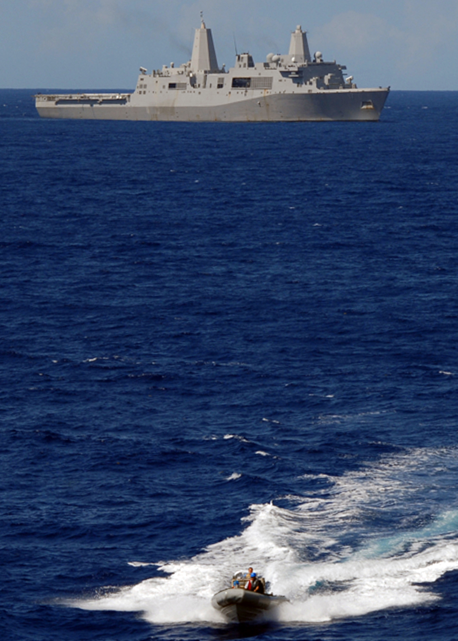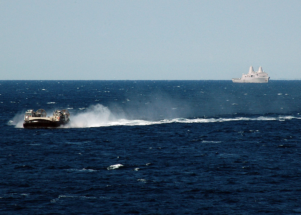 Assault Craft Unit 4 (ACU-4) passes near USS San Antonio (LPD-17) after disembarking Marines and equipment of the