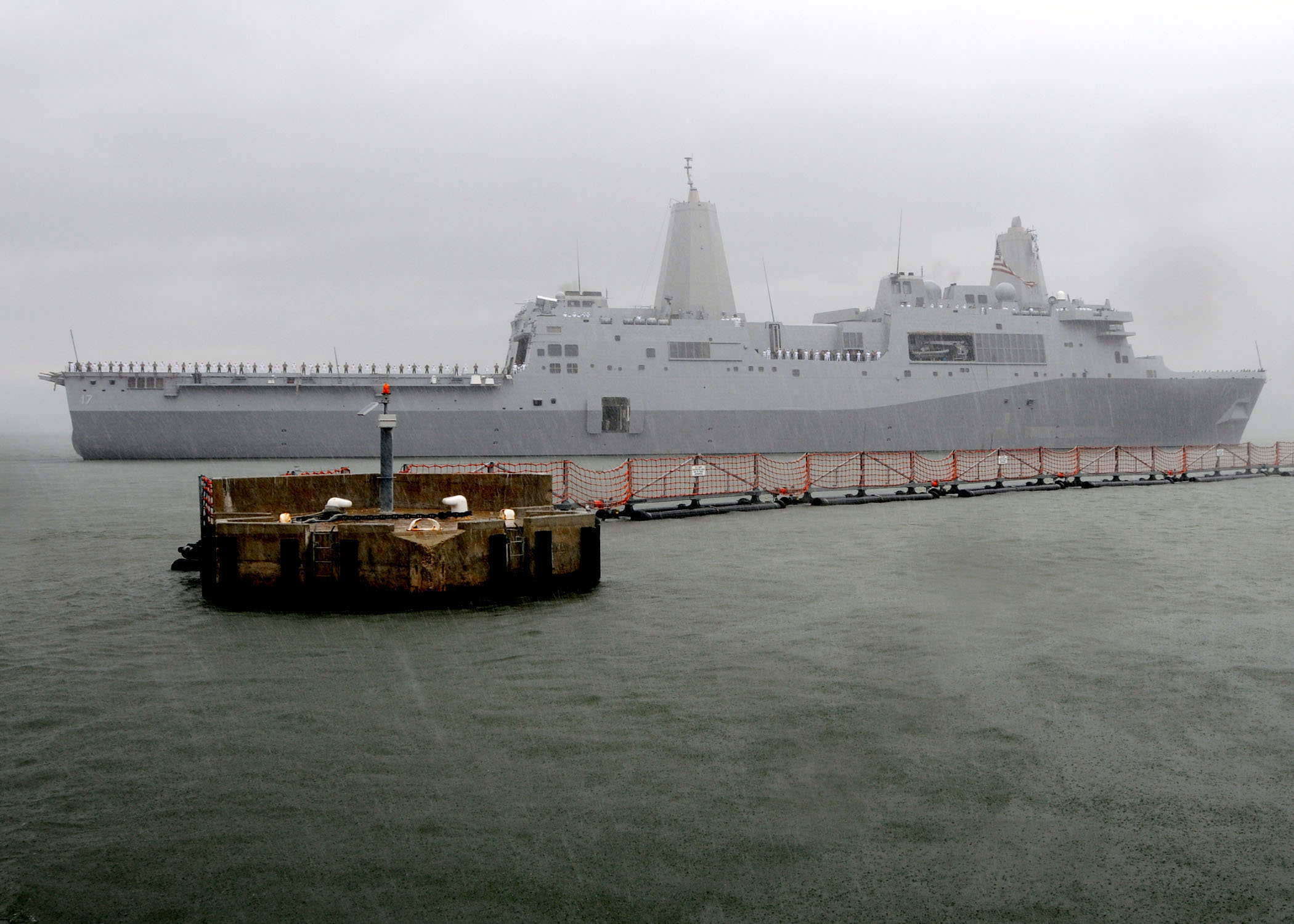 34k | San Antonio (LPD-17) arrives at her new homeport, Naval Station Norfolk, VA., December 12 2005. San Antonio stayed at Norfolk for the 2005 holidays and then sailed to Ingleside, TX. for her commissioning ceremony, January 14, 2006. US Navy photo # 051212-N-6639M-001. |