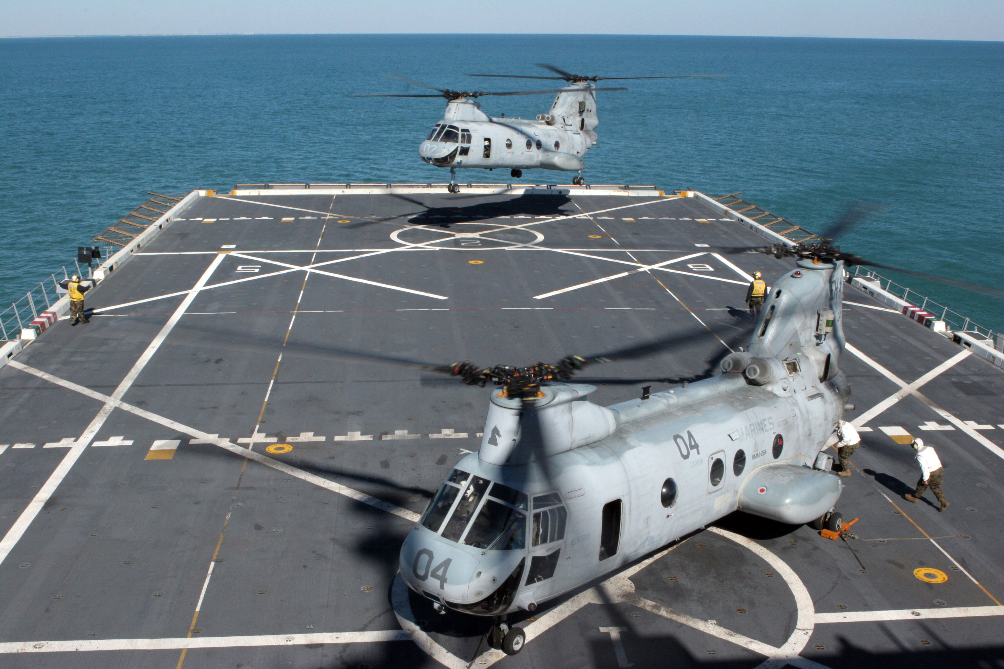 4872k | CH-46E Sea Knight helicopters, assigned to Marine Medium Helicopter Squadron (HMM) 264 (Reinforced), 26th Marine Expeditionary Unit, land on the flight deck of USS San Antonio (LPD-17), 9 March 2008. US Marine Corps photo # 080309-M-1152R-260 ATLANTIC OCEAN (March 9, 2008) by Cpl. Aaron J. Rock. |