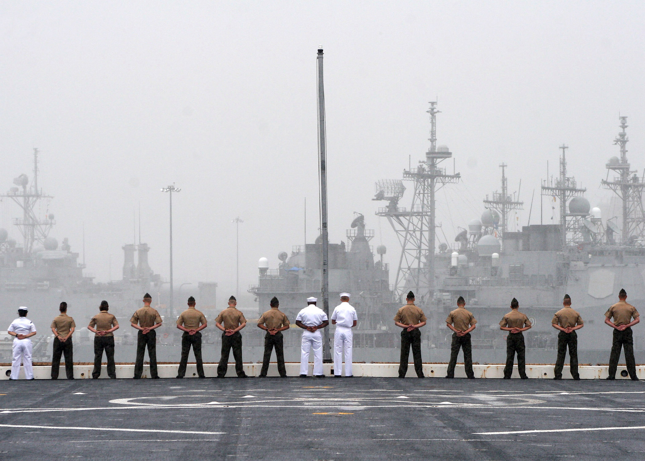 563k | Sailors and Marines aboard USS San Antonio (LPD-17) man the rails for the ship's departure for her maiden deployment, 28 August 2008. San Antonio is part of the Iwo Jima Expeditionary Strike Group en route to the U.S. 5th and 6th Fleet areas of responsibility supporting maritime security operations. US Navy photo # 080828-N-6423H-022 NORFOLK, Va. (Aug. 28, 2008) by MC1 Erik Hoffmann |