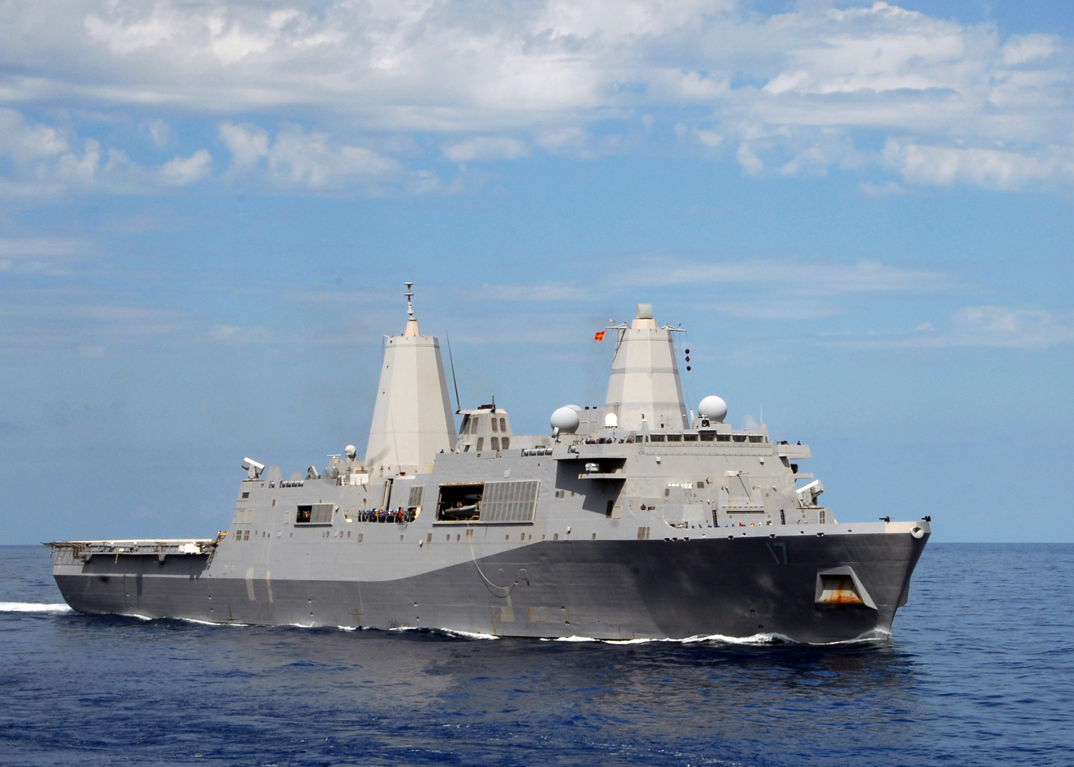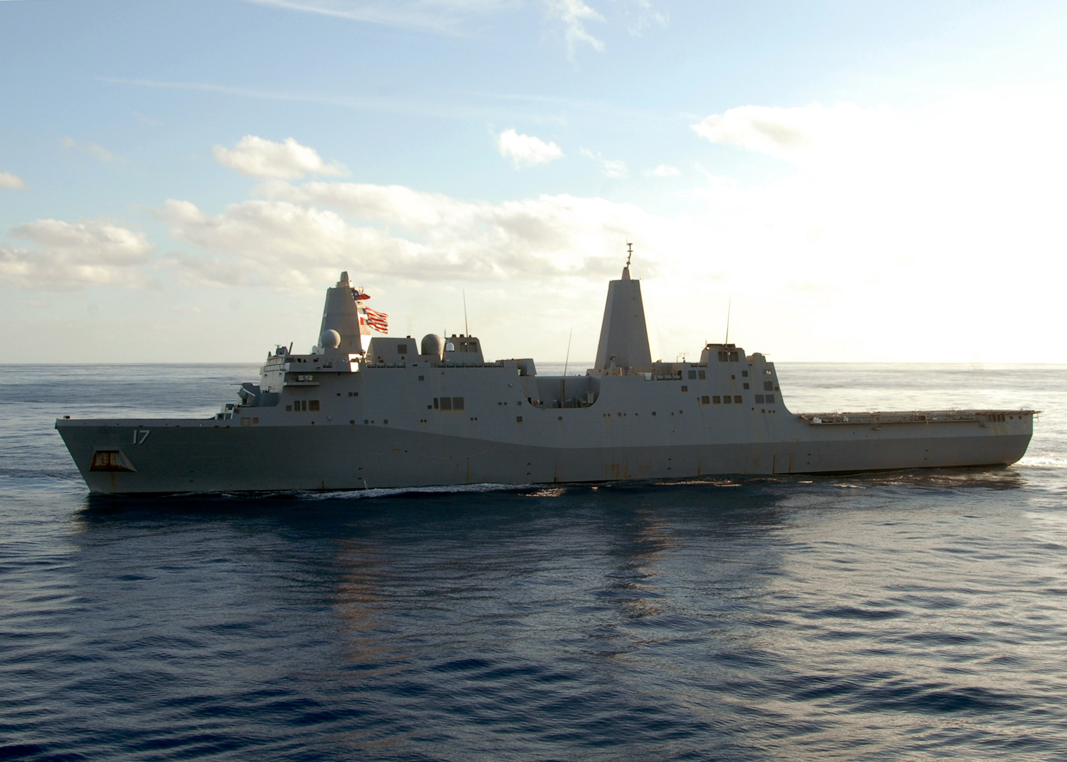 357k | USS San Antonio (LPD-17) transits the Gulf of Aden, 12 January 2009. San Antonio is the command ship for