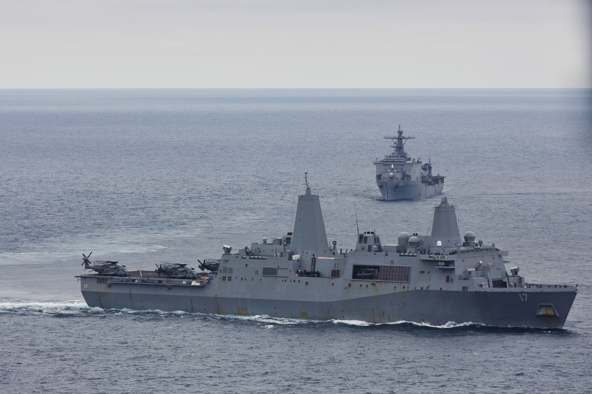 314k | The Afloat Forward Staging Base (Interim) USS Ponce (AFSB(I)15), bottom, transits the Arabian Gulf with USS San Antonio (LPD-17). San Antonio is deployed as part of the Kearsarge Amphibious Ready Group and, with the embarked 26th Marine Expeditionary Unit (26th MEU), is deployed in support of maritime security operations and theater security cooperation efforts in the U.S. 5th Fleet area of responsibility. US Navy photo # 130426-N-GZ984-198 ARABIAN GULF (April 26, 2013) by MC2 Terah L. Mollise. |