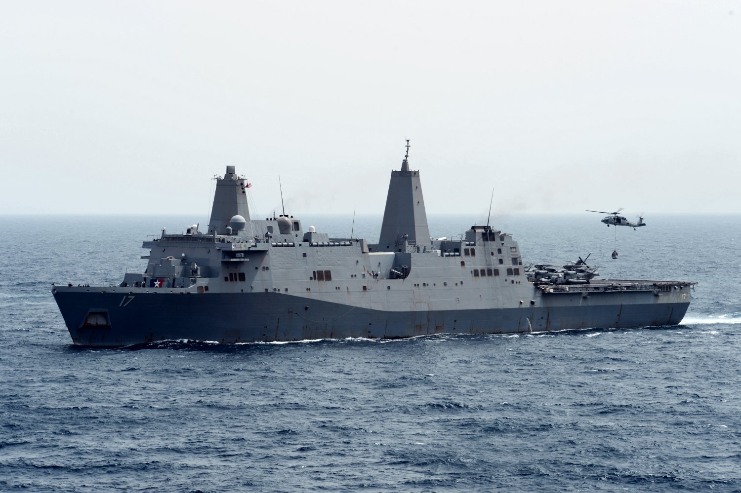 USS San Antonio (LPD-17) during a vertical replenishment with the Military Sealift Command fleet replenishment oiler