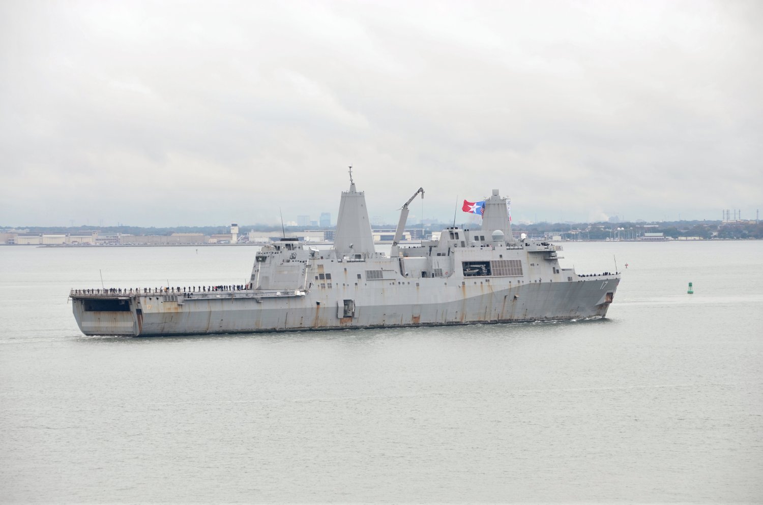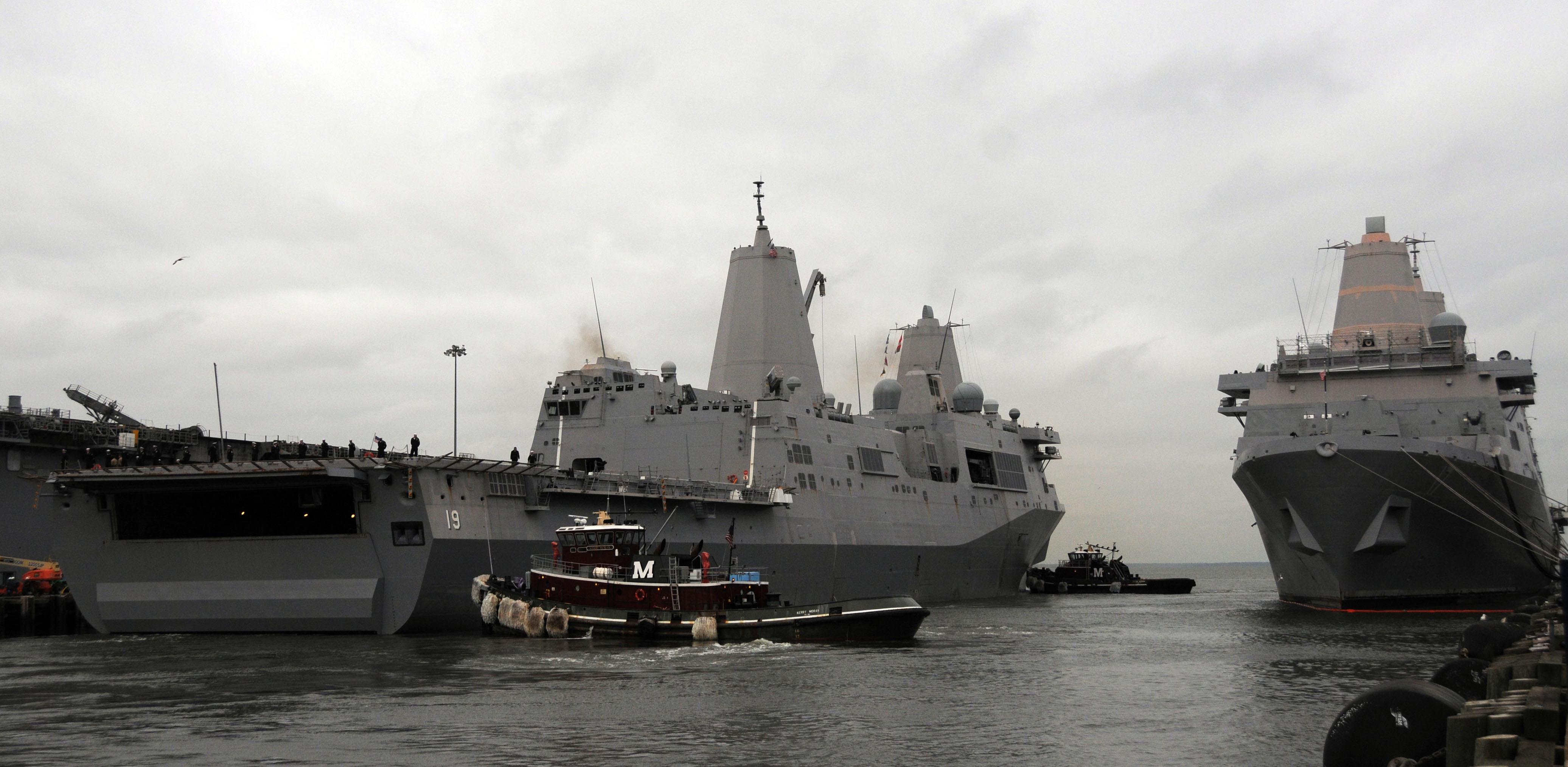 149k | USS San Antonio (LPD-17) returns to Naval Station Norfolk after completing an eight-month deployment. San Antonio was part of the Kearsarge Amphibious Ready Group supporting maritime security operations and theater security cooperation efforts in the U.S. 5th and 6th Fleet areas of responsibility US Navy photo # 131107-N-YC845-004 NORFOLK (Nov. 7, 2013), by MC1 Julie Matyascik. |