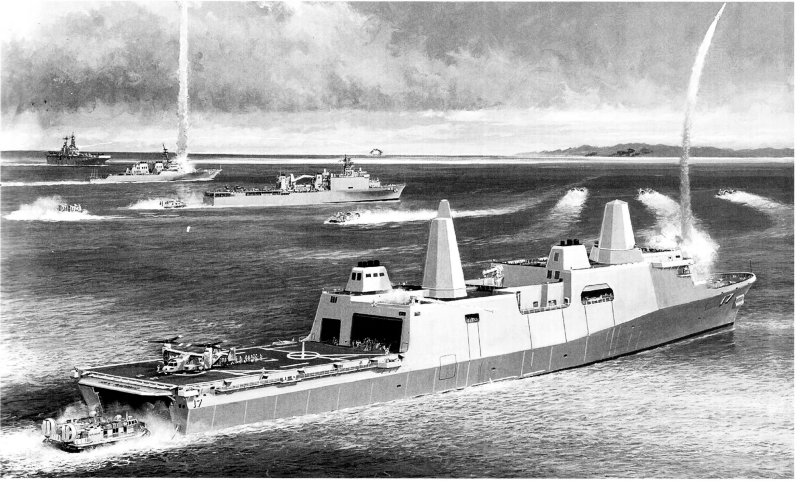 108k | Artist's impression of the San Antonio (LPD-17) Class Amphibious Transport Dock. From "U.S Amphibious Ships and Craft: An Illustrated Design History" by Norman Friedman. | Robert Hurst | |